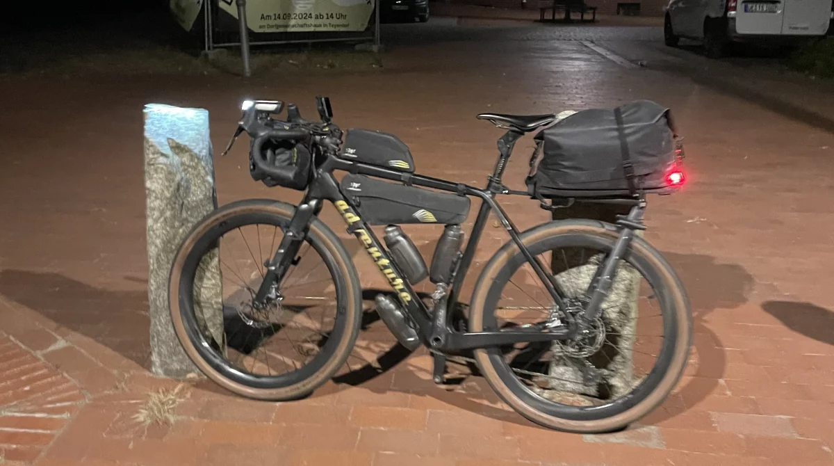 Ausreichend Licht spendet eine B&M Ixon Space auf der Landstraße. In Leuchtstufe 2 (von 8) tut sie dies ca. 30 h lang. Im Wald schalte ich eine ältere Giant Lampe dazu, die mit ihrem hellen Steulichtkegel für Klarheit sorgt. Nach hinten hält das Lidl-Rücklicht tatsächlich 9 h durch, bevor die Ersatzleuchte übernehmen muss. Und der Wahoo Roam 2 kommt nicht annähernd an seine Laufzeitgrenze. Die Powerbank bleibt also ungenutzt in der Tasche.