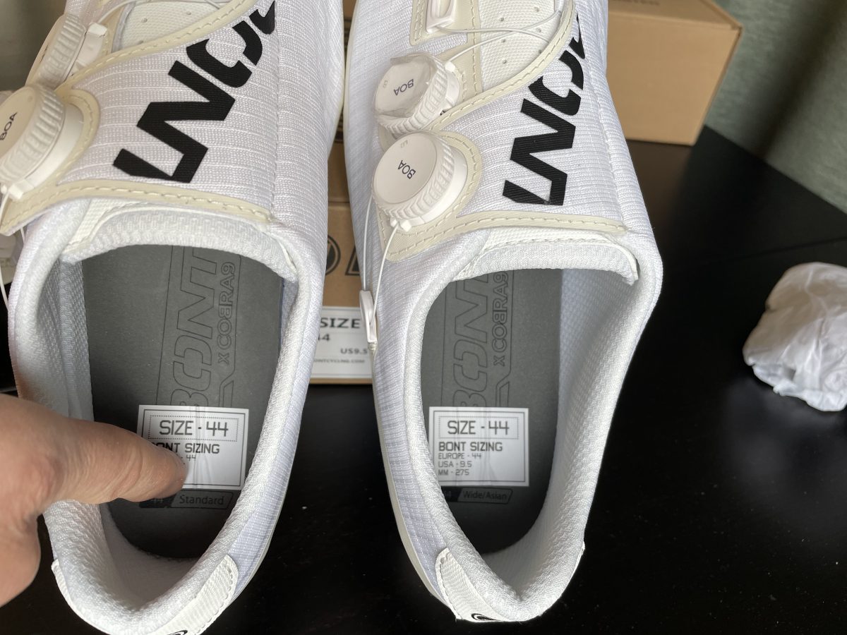 Für diesen Test bekam ich die Schuhe in Standard als auch in Wide. Und beim Tragevergleich stellte sich der Vorschlag des Beraters bei Bont als richtig heraus: bei meiner Vorgeschichte fühlt sich die Wide-Version besser an. Aber es ist nicht nur besser, sondern mein Fuß fühlt sich seit langem außergewöhnlich wohl in einem Radsportschuh. Der Schuh ist vorne fast schon eckig, statt schlank gerundet wie die meisten, aber das fällt nur auf, wenn man von oben draufguckt. Und das gute Platzgefühl in der weiten Zehenbox ist unbezahlbar.