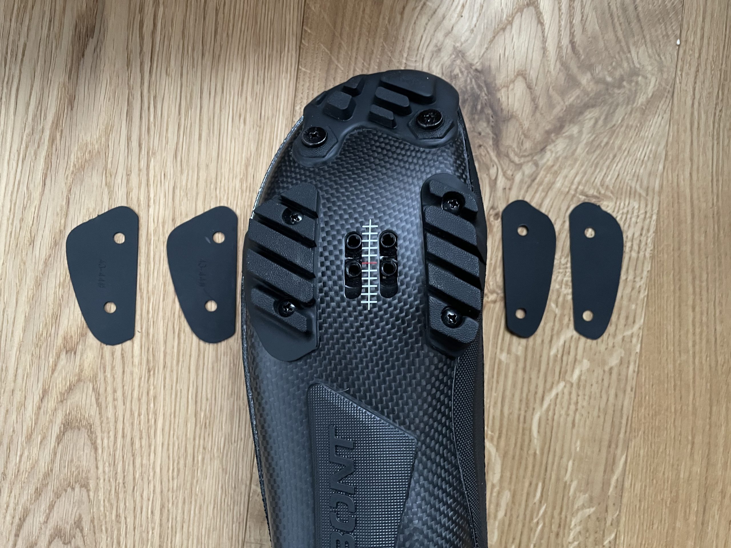 Die Carbonsohle ist aus Toray-Fasern und kann bei Bedarf durch Erhitzen des Schuhs im Ofen in gewissem Maß an den Fuß angepasst werden (Bont hat dazu ein Howto-Video auf YouTube). Die Markierungen auf der Sohle machen die Ausrichtung des Cleats zu einem Kinderspiel. Außerdem positiv ist die Möglichkeit, die Cleats sehr weit hinten anbringen zu können. Seit längerem ein Tipp unter Bike- bzw. Schuhfittern.