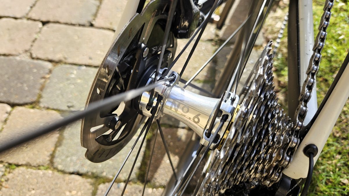 Die No 6 Laufräder fühlen sich steif an und die Kraft kommt vom Pedal auf den Asphalt. Auch hier trifft Materialeigenschaft auf Gewicht. Die Laufräder aus China geben im Wiegetritt nicht nach und halten bei Abfahrten verlässlich die Spur.