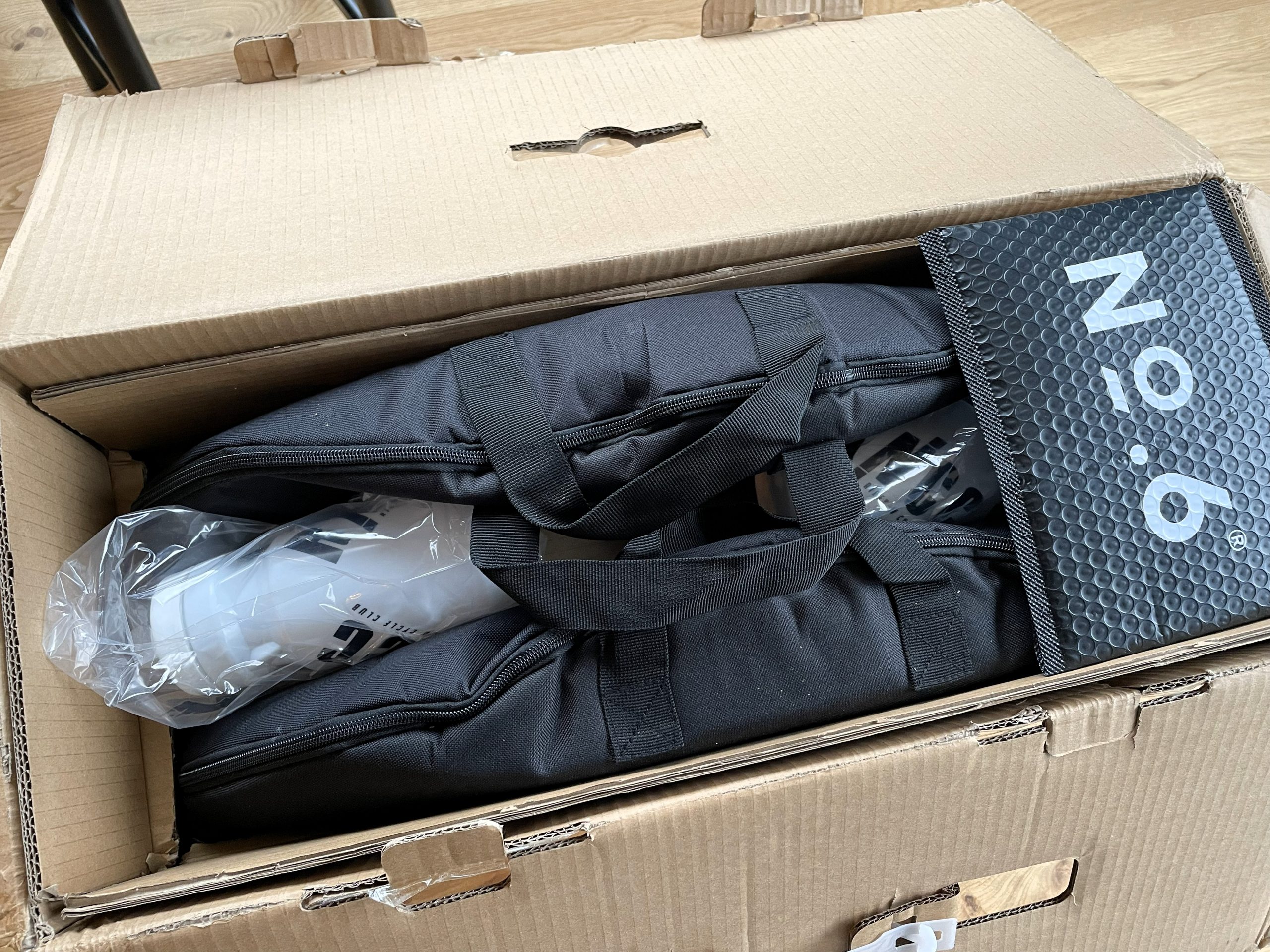 In dem robusten Karton sind die beiden Laufräder in anständig gepolsterten Taschen, die auch für Radreisen verwendet werden können. Dazu zwei Trinkflaschen, Ersatzspeichen, lange Ventile. Selbst wenn man danach sucht, findet sich hier nichts zu bemängeln.