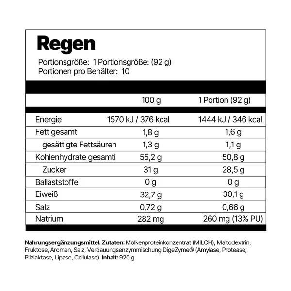 Das Regenerationsgetränk „Regen“, abgeleitet von Regeneration, nicht von dem deutschen Wort Regen, enthält pro Portion rund 50 g Kohlenhydrate im optimalen Glukose-Fruktose-Verhältnis, 30 g hochwertiges Molkenprotein und eine gezielte Elektrolytmischung. Die Rezeptur ist darauf ausgelegt, die Glykogenspeicher nach dem Training schnell wieder aufzufüllen und die Muskelregeneration zu fördern. Die Zugabe von Verdauungsenzymen sorgt dafür, dass das Produkt auch von laktoseempfindlichen Sportlern gut vertragen wird.
