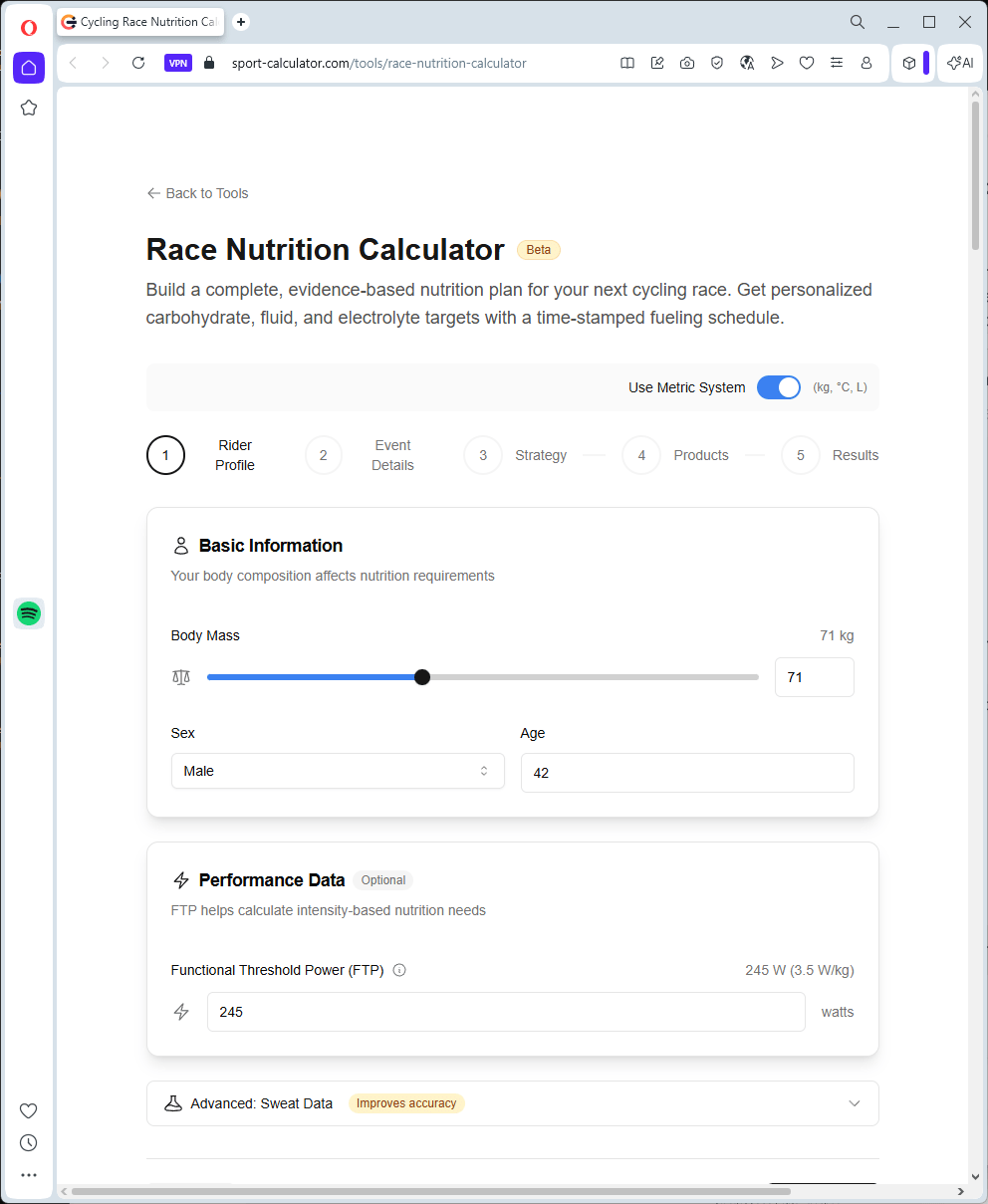 Auf der Website sport-calculator.com ist ein Rechner, der viele Faktoren berücksichtigt (Link zum Race Nutration Calculator).