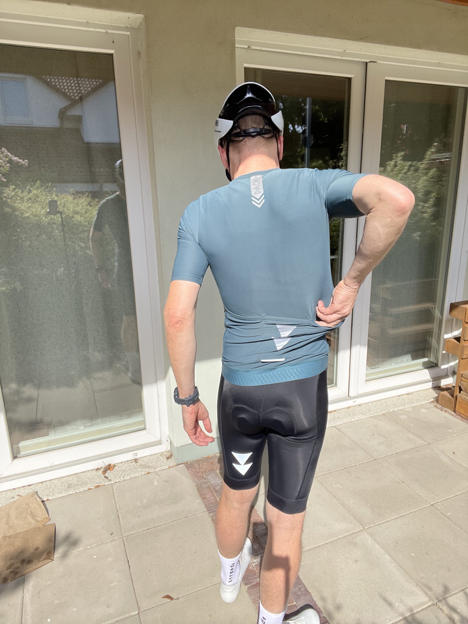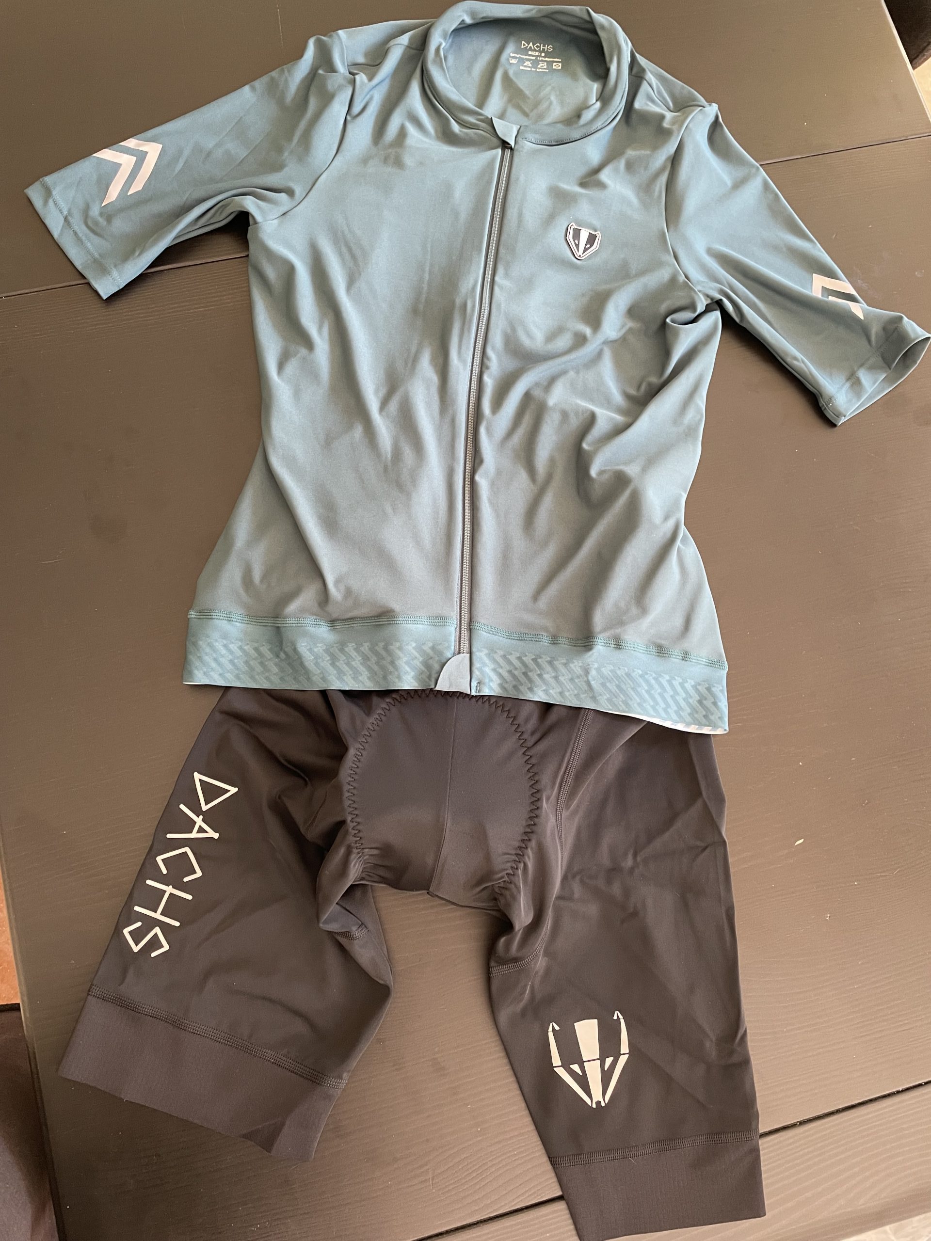 Ich bin Größe 1,79 m und wiege 65 kg. Ich passe bei fast allen Herstellern in die S-Größe. Dachs macht da keine Ausnahme. Die kurze Sommerhose und das kurzarm Jersey liegen an. Und zwar perfekt: an keiner Stelle wölbt sich das Oberteil, keine Falten, kein Flattern, es bildet meine Körperkonturen perfekt nach.