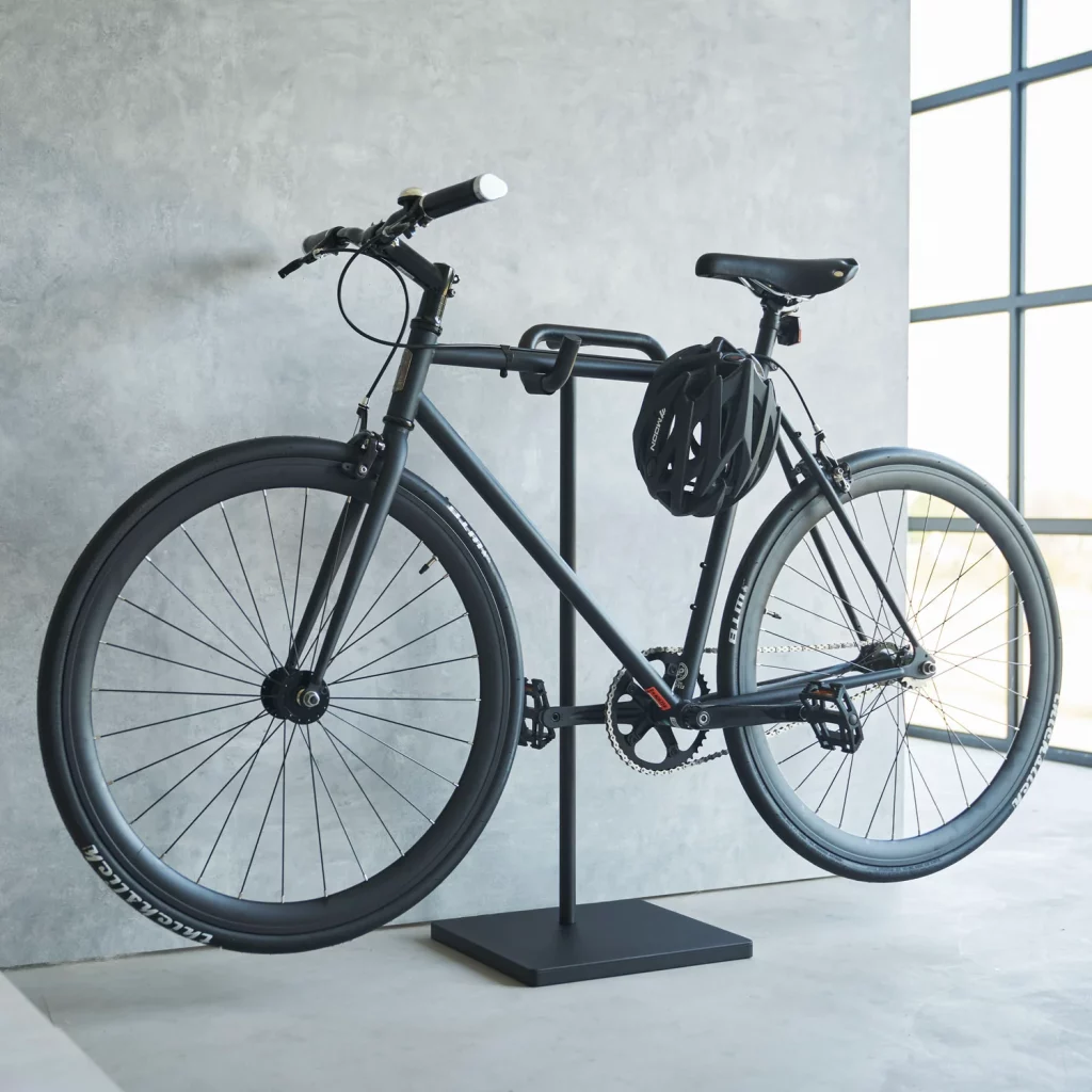 Der Yamazaki Bicycle Stand zielt auf praktischer Aufbewahrung und modernem Wohnen. Er ist kein Werkstattständer, sondern ein Wohnobjekt, das zufällig auch ein Rennrad trägt.