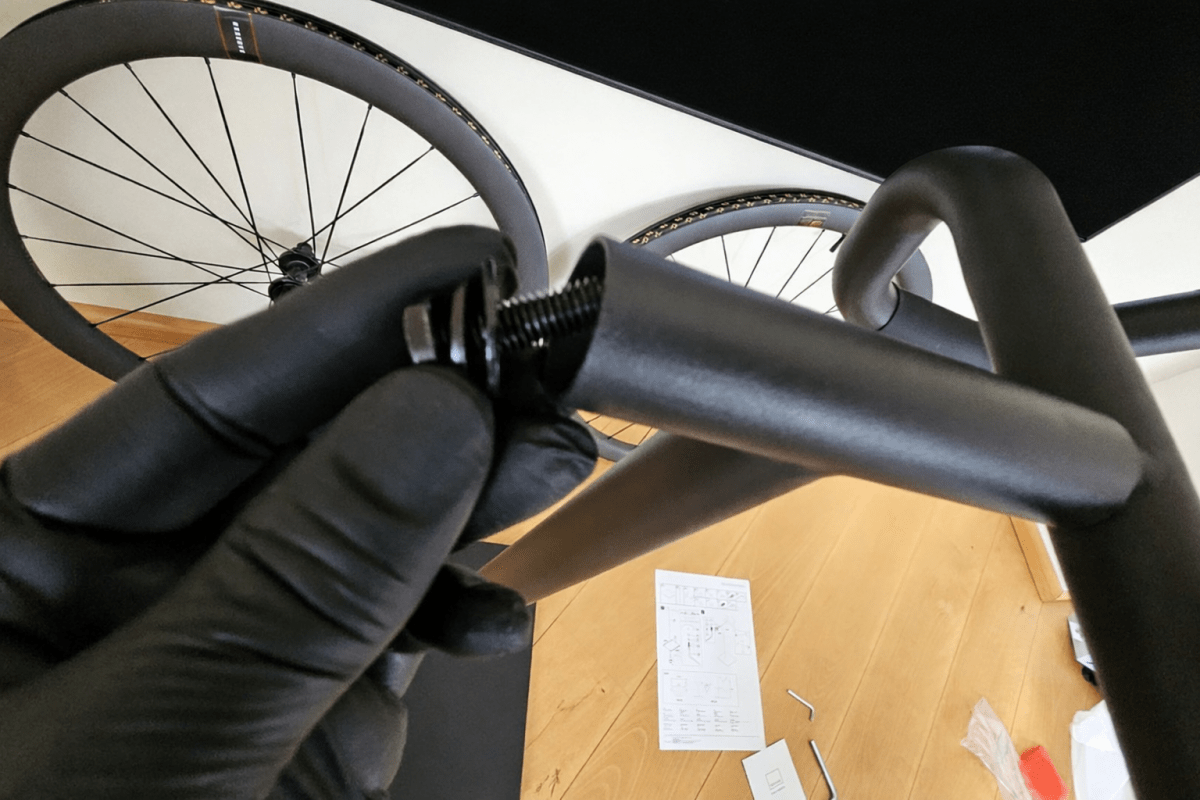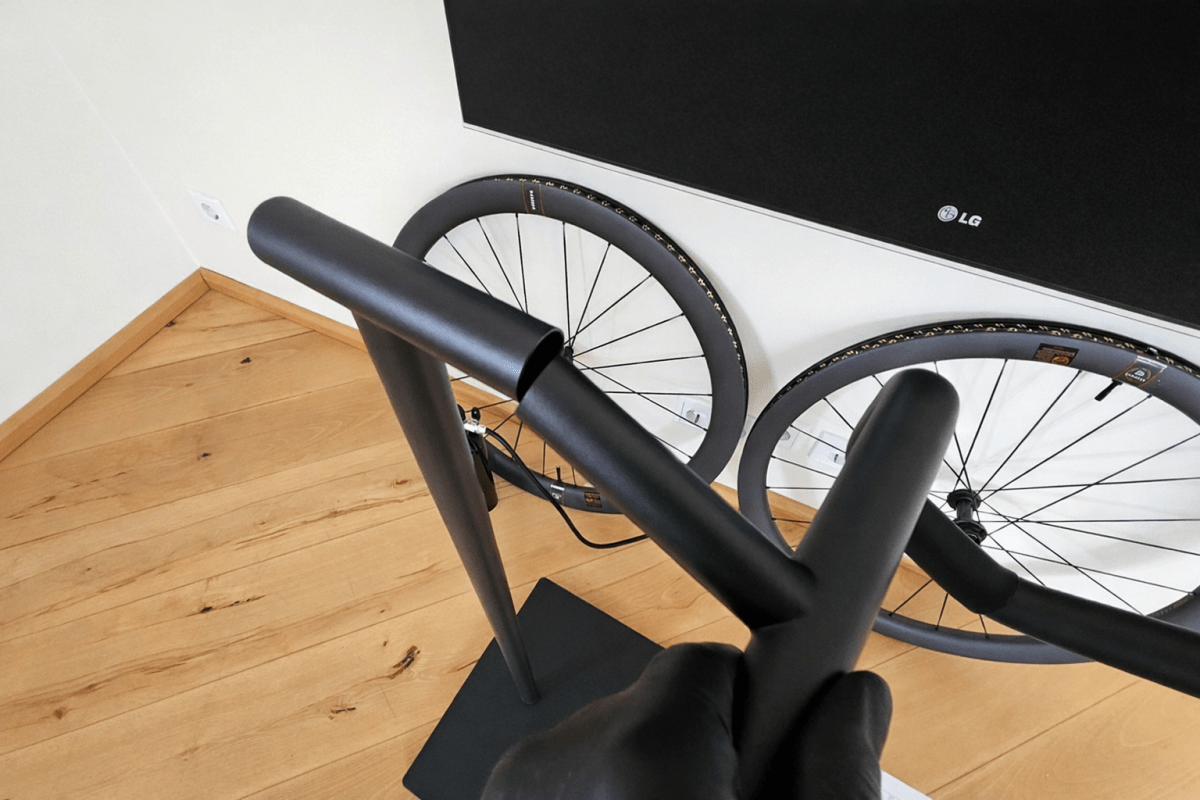 Die Kontaktflächen sind einem Silikonschlauch versehen, damit der Rahmen keine Kratzer abbekommt. wenn ein teurer Carbonrahmen im Spiel ist. Vorne könnte ich auch noch einen Helm wie auf einen Haken hängen, aber das gefällt mir nicht. Mit einer unverbindlichen Preisempfehlung von rund 145 Euro bewegt sich der Ständer klar im Premiumsegment, passt damit aber auch zur Zielgruppe Radsportenthusiasten.