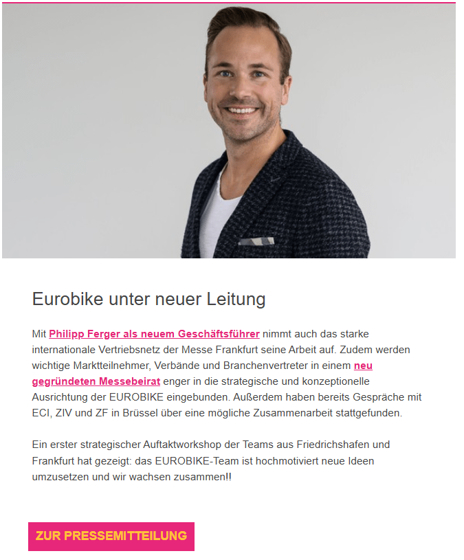 Am 29. verkündete die Eurobike im Newsletter den Wechsel am Schreibtisch des Geschäftsführers. Mit der Absage des japanischen Komponentenriesen Shimano am 30. Januar hätte der neue Mann an der Spitze der Eurobike wohl ein Bild ausgewählt, worauf der nicht so strahlend lächelt. Das der Link „zur Pressemitteilung“ ins Leere führt, ist hoffentlich nur Zufall.
