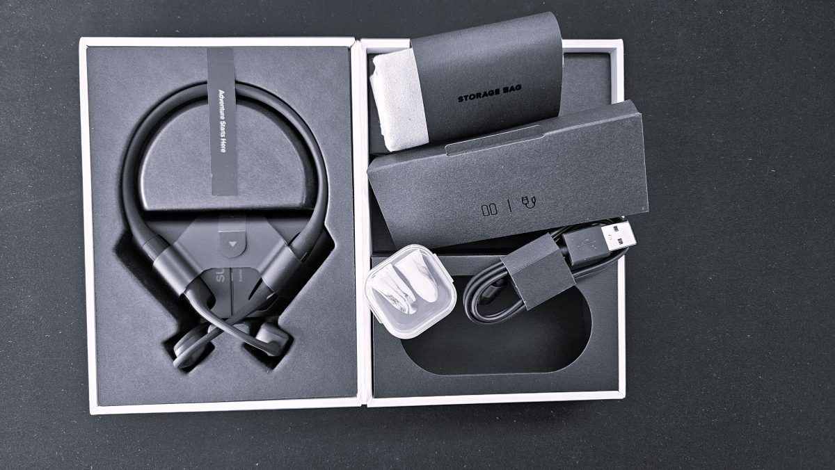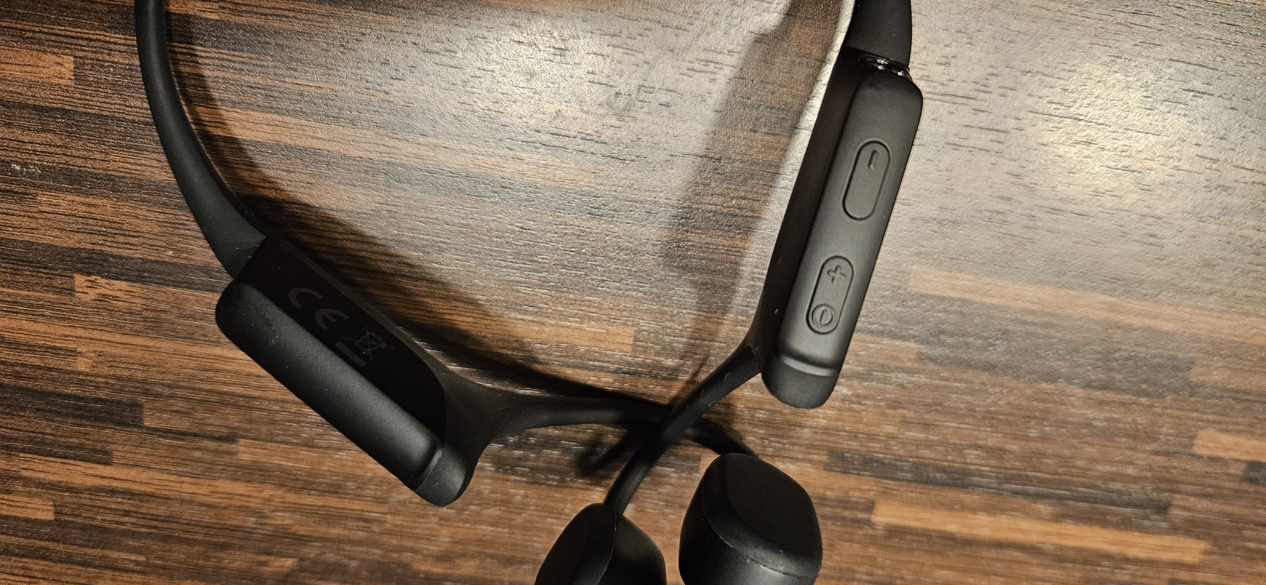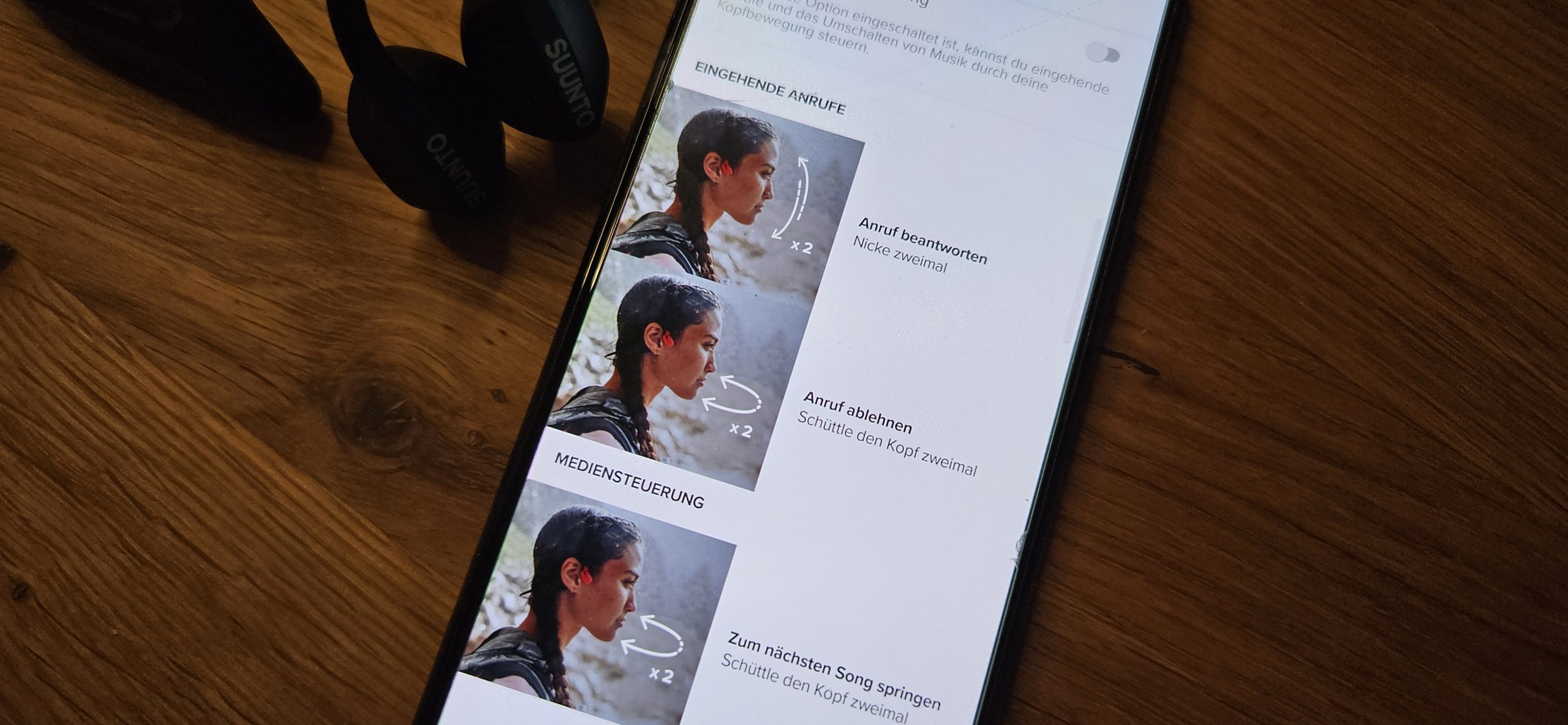 Das ist wiederum ein echtes Highlight. Mit Kopfschütteln wird zum nächsten Song geskippt, mit nicken wird der Anruf angenommen. Am Knochenschall-Kopfhörer selbst sind drei Knöpfe. Abheben und Auflegen und Play/Pause geht mit einem Klick, zum nächsten Titel springen oder zurück mit zwei bzw. drei Mal antippen. Laut und Leise, An und Aus funktioniert natürlich auch.