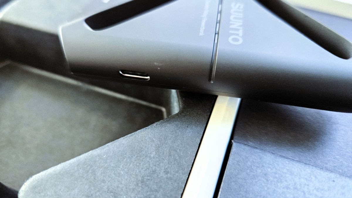 Die Burntime der Batterie ist mit 10 Stunden realistisch angegeben, bei üblicher Lautstärke. Gut gefällt mir die kleine Powerbank, die im Karton dabei ist. Suunto hat hier auch weitergedacht, denn ein kleiner Bügel hält die Kopfhörer während des Ladens fest. So wird der Ladevorgang, zum Beispiel bei einer Wanderung im Rucksack, nicht unterbrochen. Komplettes aufgeladen der Kopfhörer dauert circa einer Stunde. Die Powerbank braucht zum vollen Aufladen etwa 1,5 Stunden und Strom kommt über einen USB-C Anschluss.