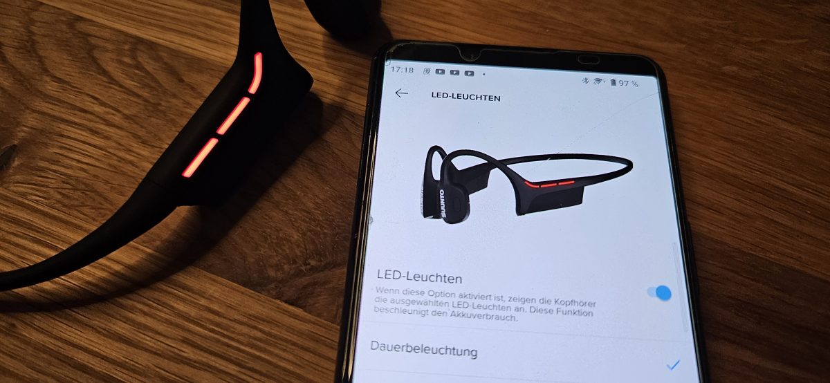 Da werden Kindheitserinnerungen war. LED wie bei Knight Rider laufen bei Bewegung links und rechts am Kopfhörer. Ob die kleinen Dinger wirklich die Sichtbarkeit maßgeblich erhöhen, bezweifle ich. In der App kann dauerleuchten, Blinke und ein SOS Signal eingestellt werden. Für die Nicht-Pfadfinder: kurz-kurz-kurz-lang-lang-lang-kurz-kurz-kurz.