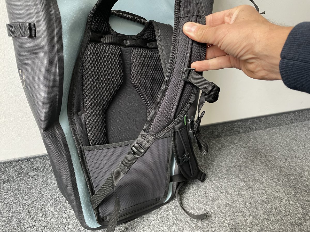 Das Rucksacktragesystem ist sehr angenehm am Rücken. Die Einstellbänder für die Länge der Trageriemen flattern nicht herum sondern sind enganliegend geführt. Der Rucksack lässt sich für kürzere Strecken mit dem Rad auch problemlos auf dem Rücken tragen.