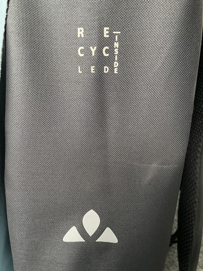 Beim Unboxing der Vaude Aqua Tansformer aus der dünnen Plastikverpackung fällt mir als erstes ins Auge, dass an einigen Stellen das Wort Recycled zu lesen ist. Recycling und Re-use ist heute ein Trend, daher ist das für mich positiv konnotiert. Auch ist der Anhänger mit einem Packpapierband befestigt, was den Nachhaltigkeits-Style verstärkt. Bei Vaude ist das keineswegs nur Green Nudging, die Firma aus Tettnang ist bekannt für ökologisch und sozial nachhaltige Produktion.