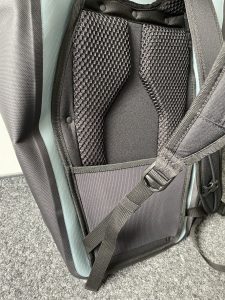 Die innere Verstärkungsplatte auf der Seite des Gepäckträgersystems  ist etwas kurz oder insgesamt zu klein geraten. Der Rucksack kann dadurch am Gepäckträger viel flexen und stellenweise hatte ich Angst, dass der Rucksack in die Speichen geraten könnte, wenn viel Bewegungsmoment anliegt (z.B. im Wiegetritt). Ist jedoch bislang nicht passiert.