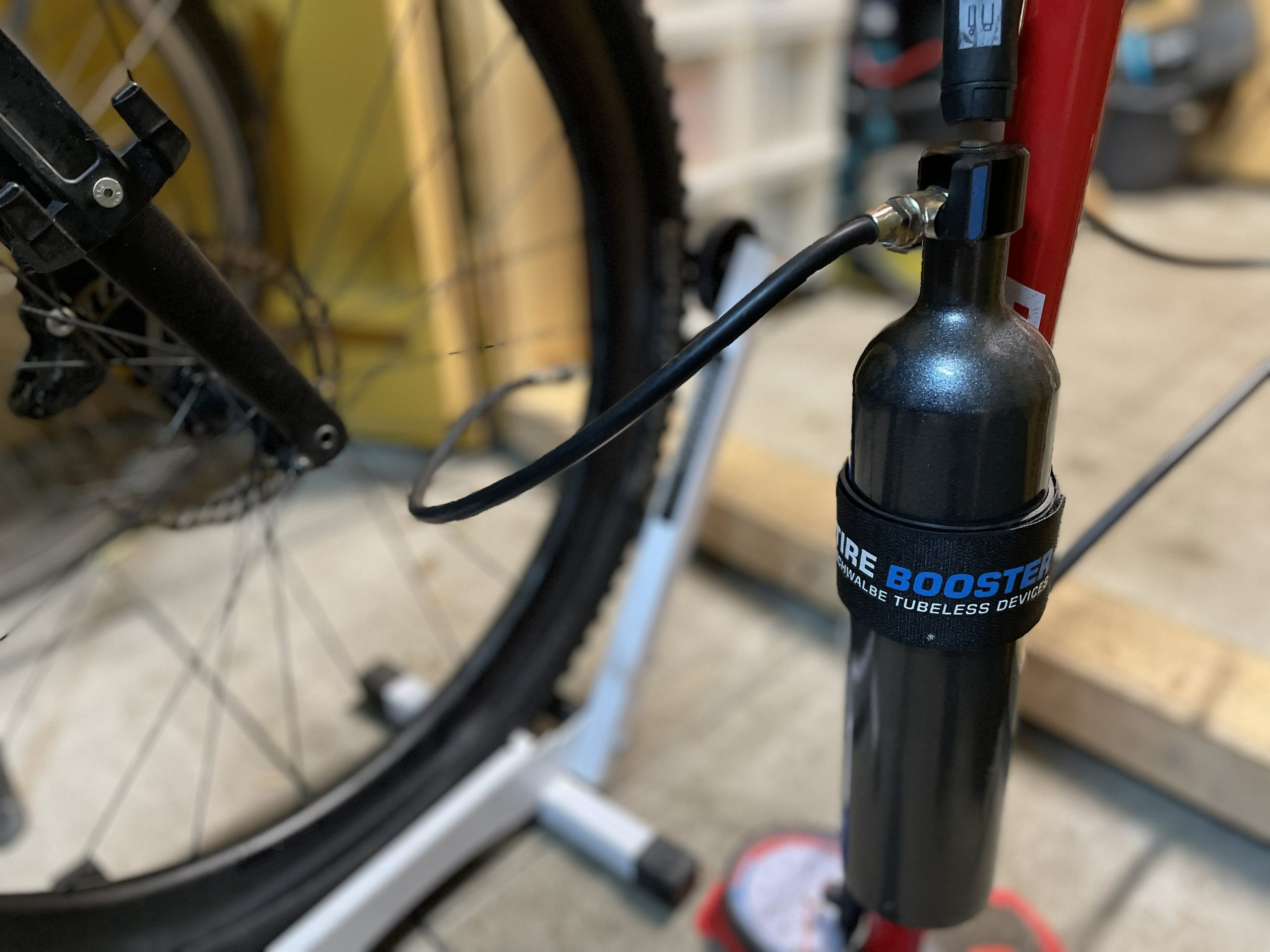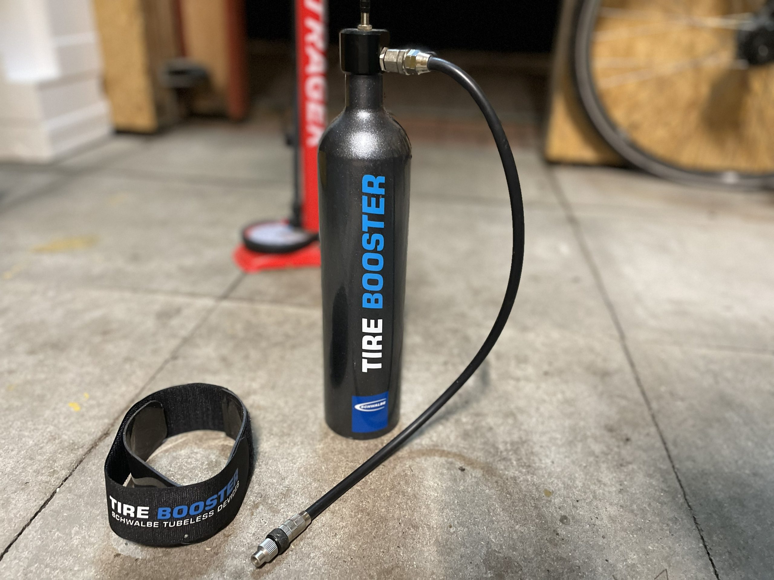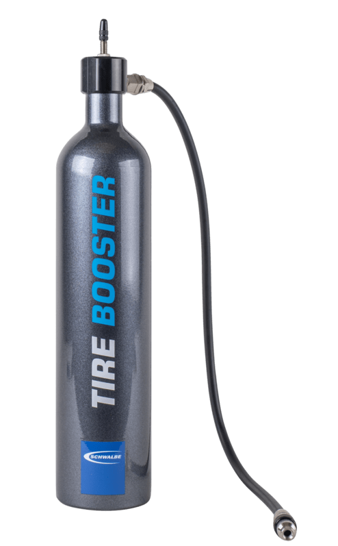 Beim Schwalbe Tyre Booster handelt es sich um eine kleine Gasflasche mit Schlauch und Ventil. Die punktet damit, leicht verstaubar zu sein und hat auch technische Stärken.