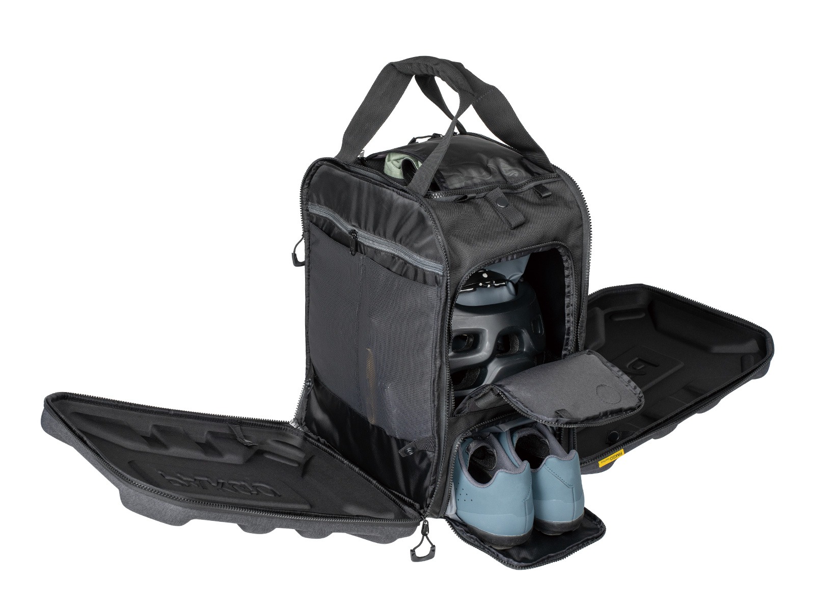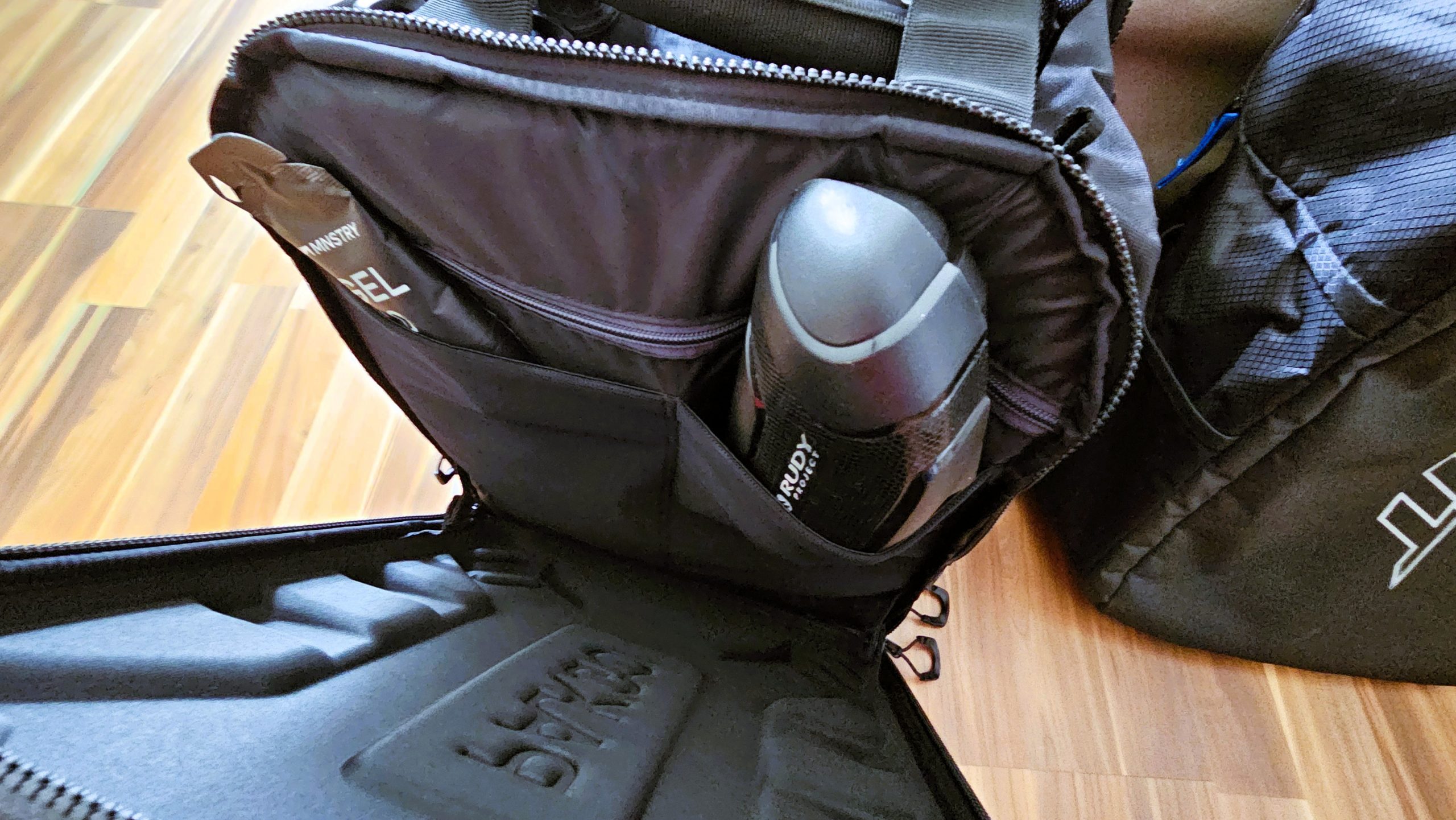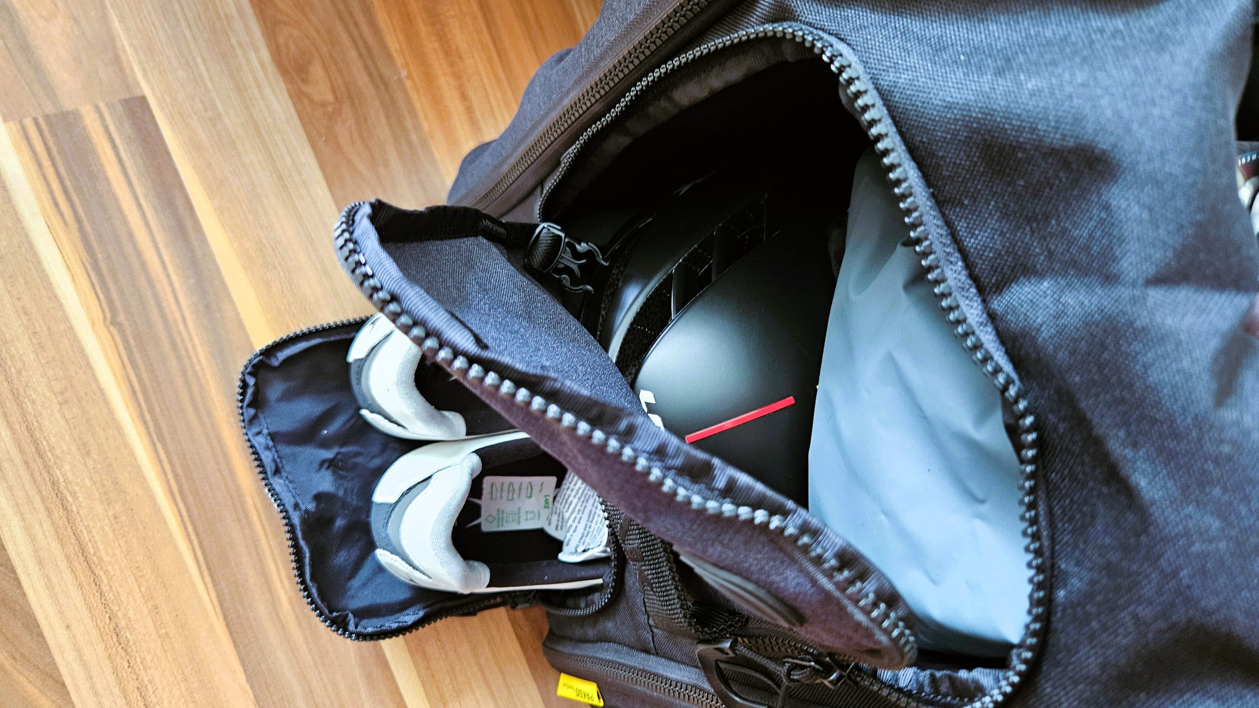 An der oberen Seite geht es in den Platz für Trikot, Hose, Handtuch etc. Das Inlay ist so gemacht, dass es nicht bis ganz nach unten reicht. So kommt es nicht zu Falten links und rechts vom Helm, der im Fach darunter liegt. Kleine Teile gehen nicht „verloren“ und alles bleibt ordentlich und sofort von oben greifbar. Auf der Klappe ist noch ein kleines, flaches Fach mit Mash. Das ist der typische Platz für Papiere, Dokument der Registrierung oder einen netten Sticker mit Motivationsspruch.