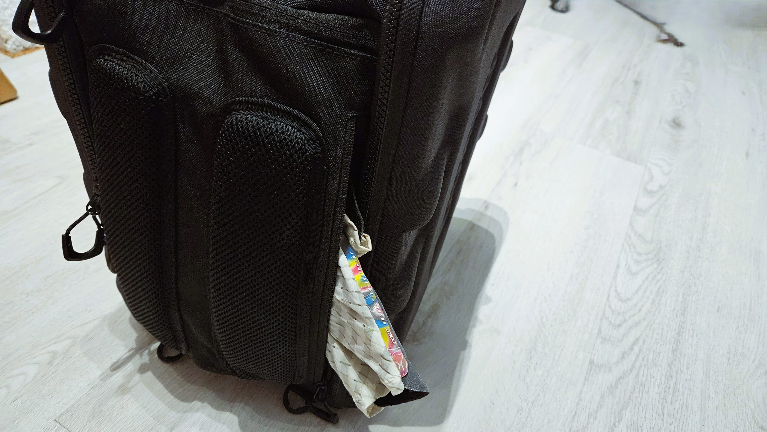 Dann ist da noch schönes Fach, worin die Gurte versteckt sind, damit die Tasche zum Rucksack wird. Die Polsterung sieht angenehm aus, als Rucksack werden ich die Tasche nur selten verwenden. Ein kleines Fach an der Seite ist noch gut für Dinge, die in der Hektik beim Start nicht sofort greifbar sein müssen – oder sicher verstaut werden müssen, zum Beispiel Portemonnaie und Schlüssel.