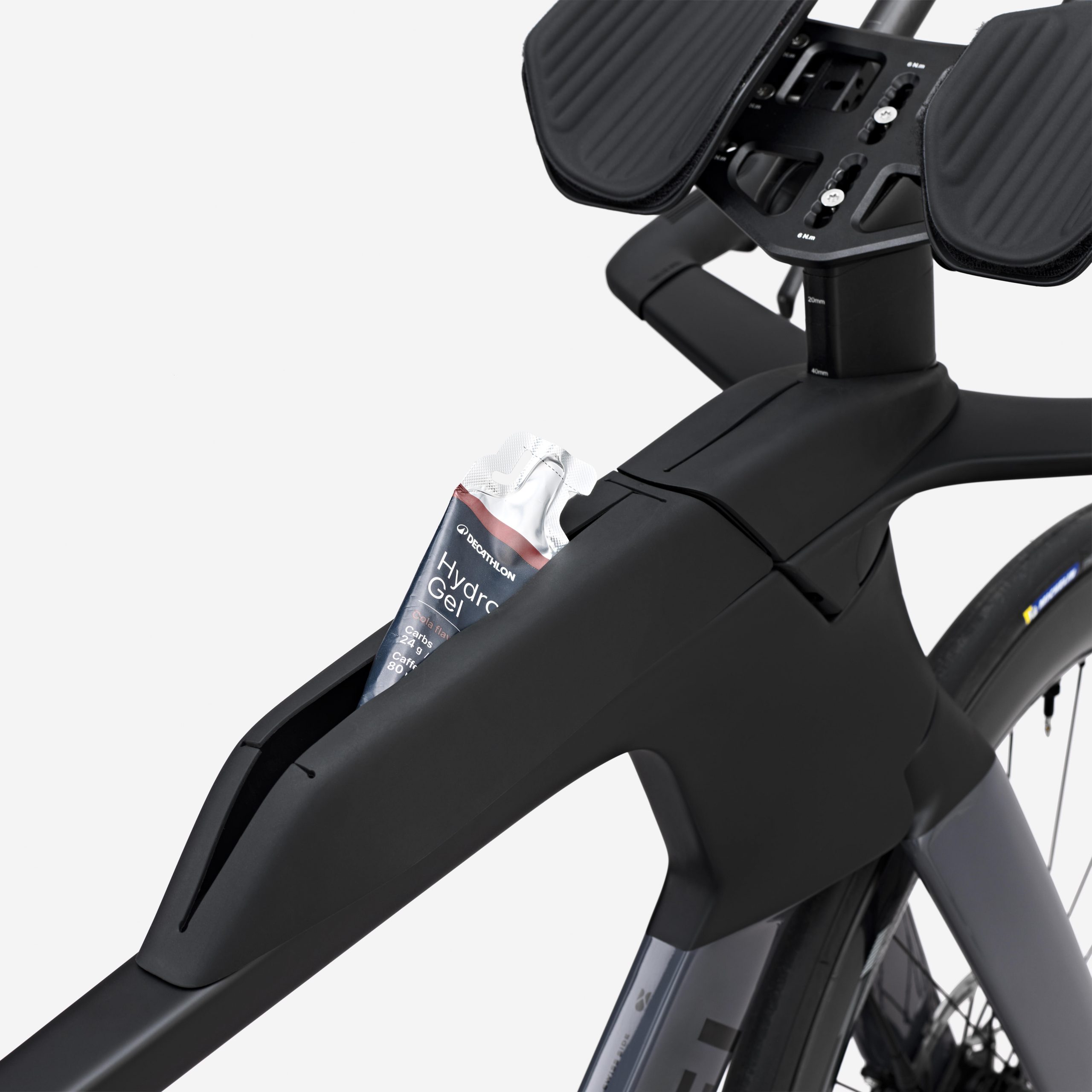 Ob die kleine Pumpe, Reifenheber und Schlauch im Lieferumfang inbegriffen sind, steht leider nirgendwo zu lesen. Hinten am Sattel lässt sich ein Trinkflaschenhalter anbringen, für eine zweite Flasche ist Platz zwischen den Aerobars. Hat das einen negativen Impact auf Aerodynamik? Die Bento-Box auf dem Oberrohr ist da, was fehlt ist allerdings ein integrierter Tank. Stattdessen ist beim Van Rysel Triathlonrad ein kleines Fach für die leeren Gelpackungen.