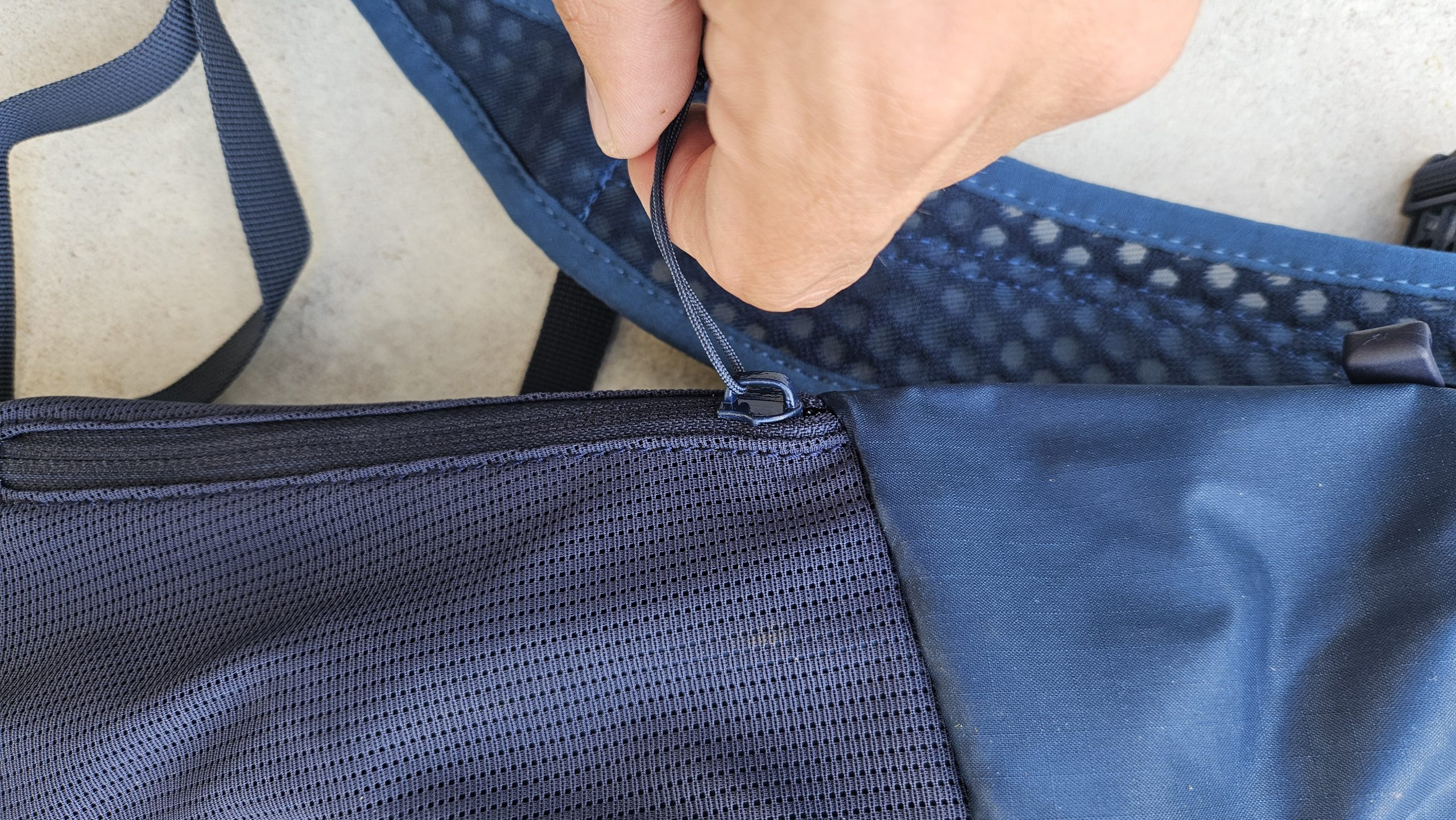 Links und rechts sind zwei Taschen mit Mashgewebe. Eine davon mit Reißverschluss, in die andere passt sogar das Hartcase der Rudy Project Brille. Am Schultergurt, auf Höhe des Brustgurt gibt es die klassischen Halterung für einen Trinkschlauch. Ebenso traditionell sind die reflektierenden Streifen auf der Vorderseite.
