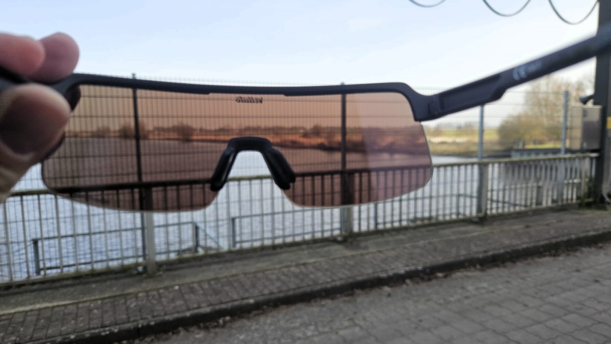 Auf dem Gravel und ruppigen Wegen und dem Rennrad bleibt die Brille sofort stabil auf der Nase. In Tests von anderen Rennradbrillen wird die Kombination aus verstellbaren Nasenpads und gummierten Bügeln häufig als Goldstandard für sicheren Sitz genannt. Da hat sich Velluto schon mal einen Platz auf dem Podium gesichert.