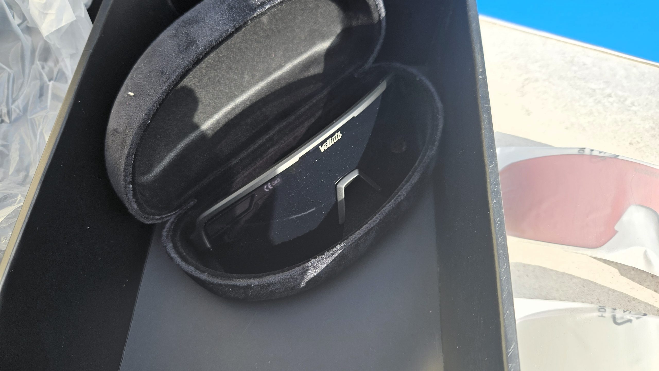 Ich hab mir das Dolce Vita Bundle geholt, inklusive Wechselglas, Etui, Tuch und Pflegespray. Im Vergleich zu etablierten Herstellern wie Oakley, Rudy oder Kaask fehlt Velluto bislang die Publicity in den großen Heftchen wie Tour und Rennrad. Das Dolce Vita Bundle muss daher vor allem das eigene Produktversprechen auf der echten Straße einlösen