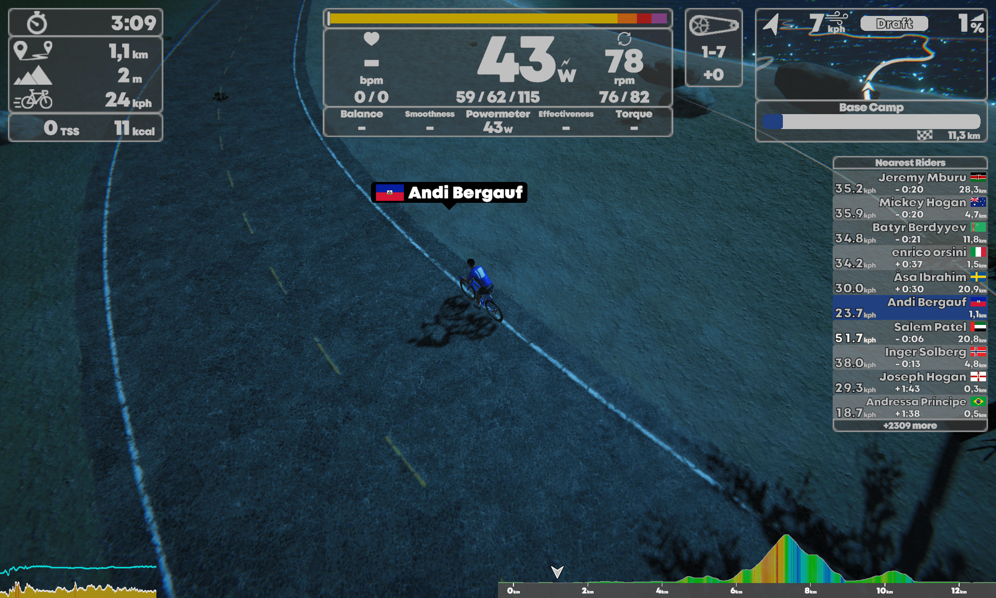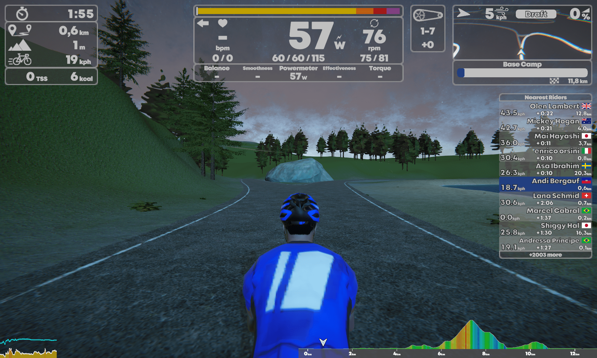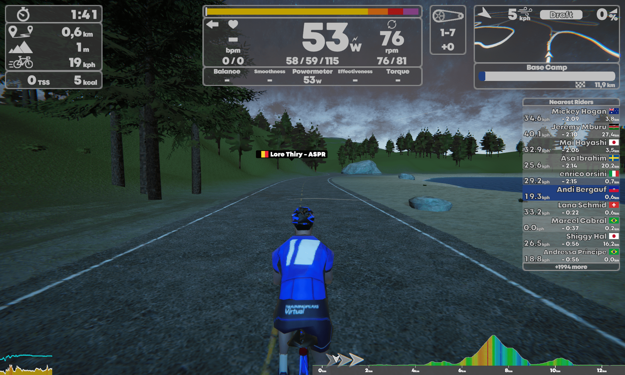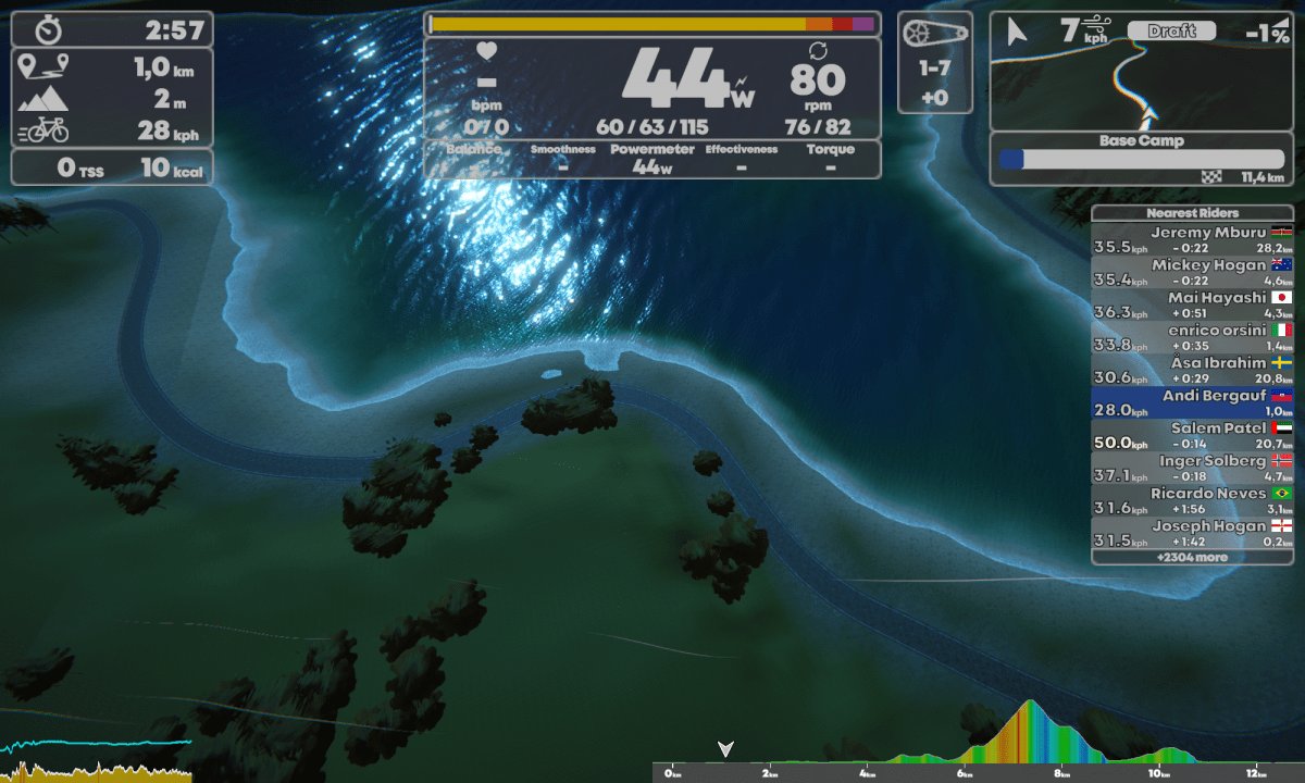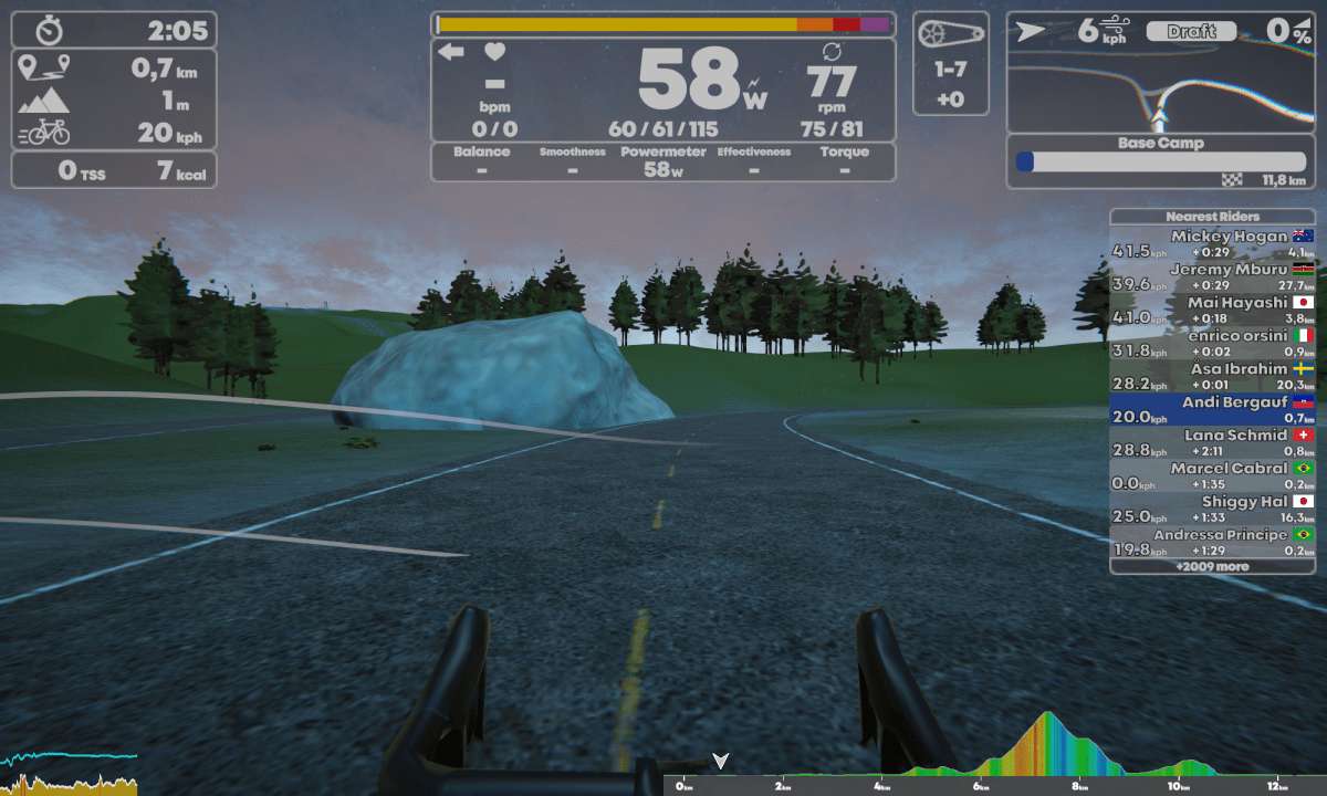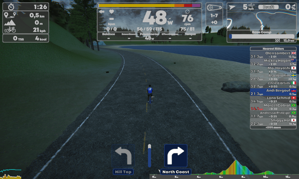 Während der Fahrt habe ich die Möglichkeit mich in satten 10 Perspektiven anzuschauen. Wenigstens die kann ich mit dem Nach-vorne-Taster an der Bremse des Smartbike durchklicken. Zurück geht leider nicht, was bei der Menge an Perspektiven nicht übel gewesen wäre. Ein gutes Feature bei Zwift ist zurück schauen. Bei Rennen kann sich so kurz umgedreht werden um zu sehen, wie die Gegner sich positionieren. Der Radfahrer bleibt bei TP Virtual immer auf der Ideallinie, die Links- und Rechtstasten steuern nur die Route bei einer Abzweigung.
