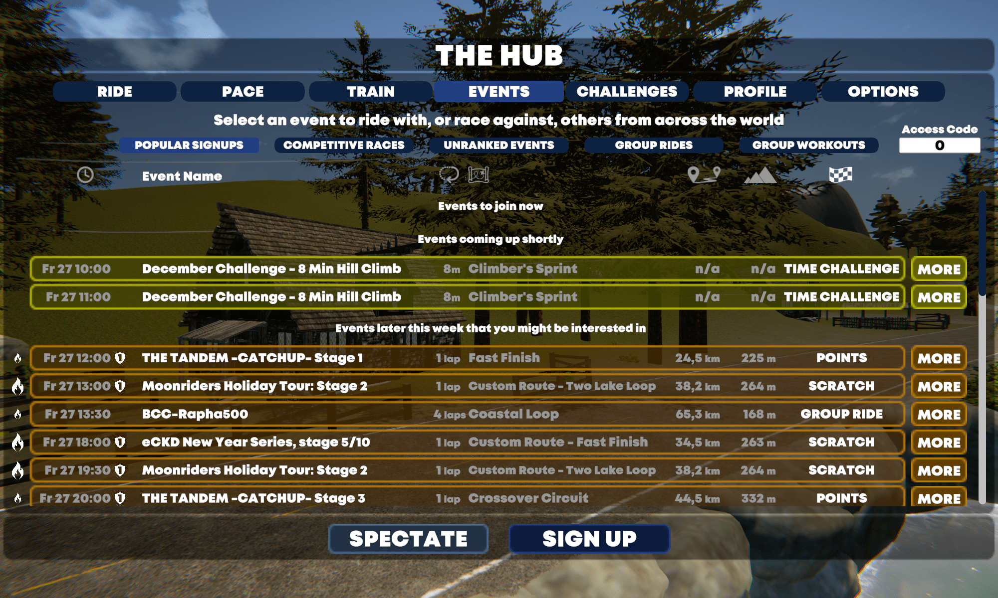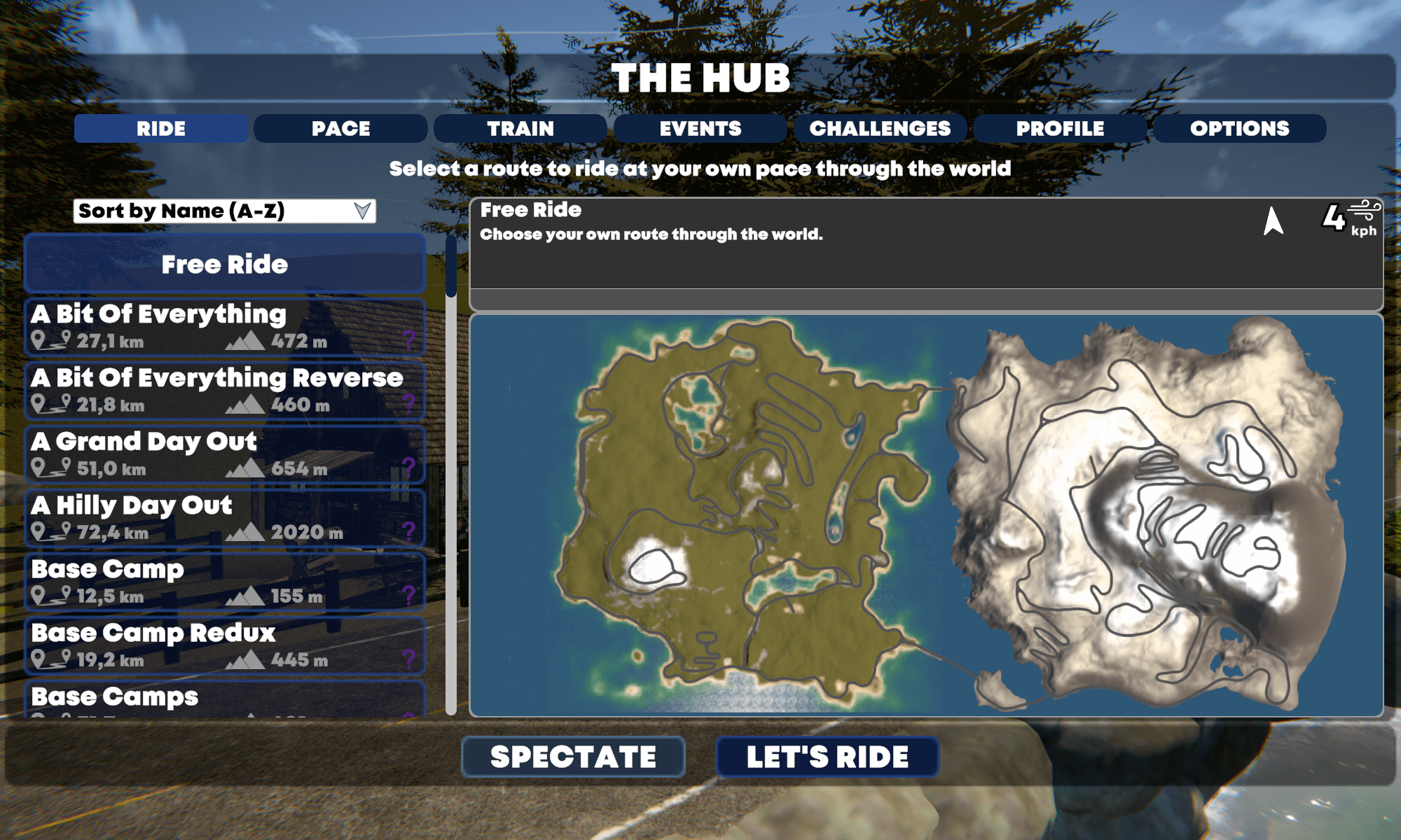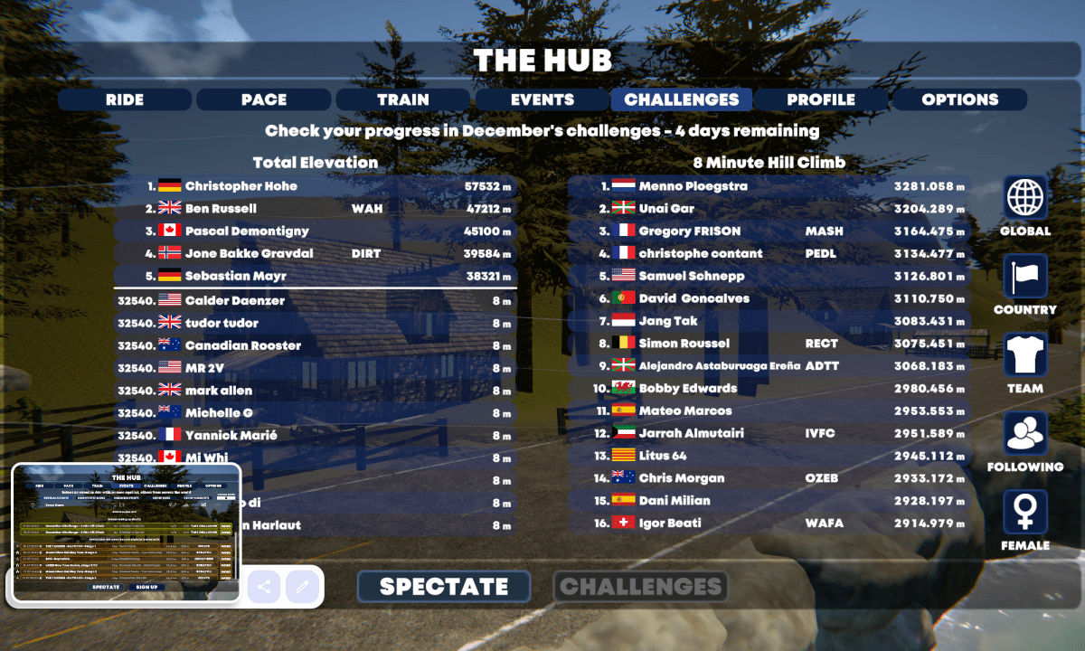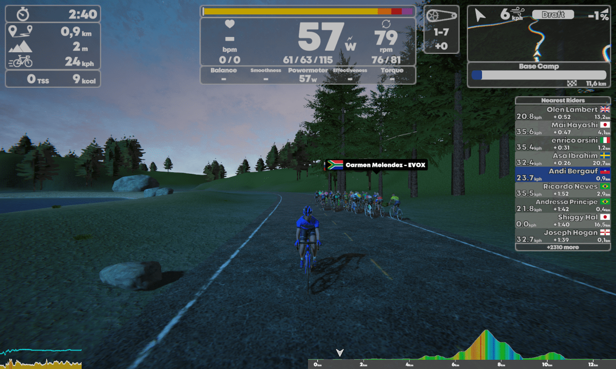 Im Hub, so nennt sich das Menü für die anstehende Trainingsfahrt, habe ich dazu noch die Möglichkeit Events auszuwählen, mir anzusehen was Kontrahenten schon abgerissen haben und denen auch zugucken, aber, und das ist wieder toll, auch direkt meine Profileinstellungen etc. zu verändern ohne groß hin und her zu klicken.