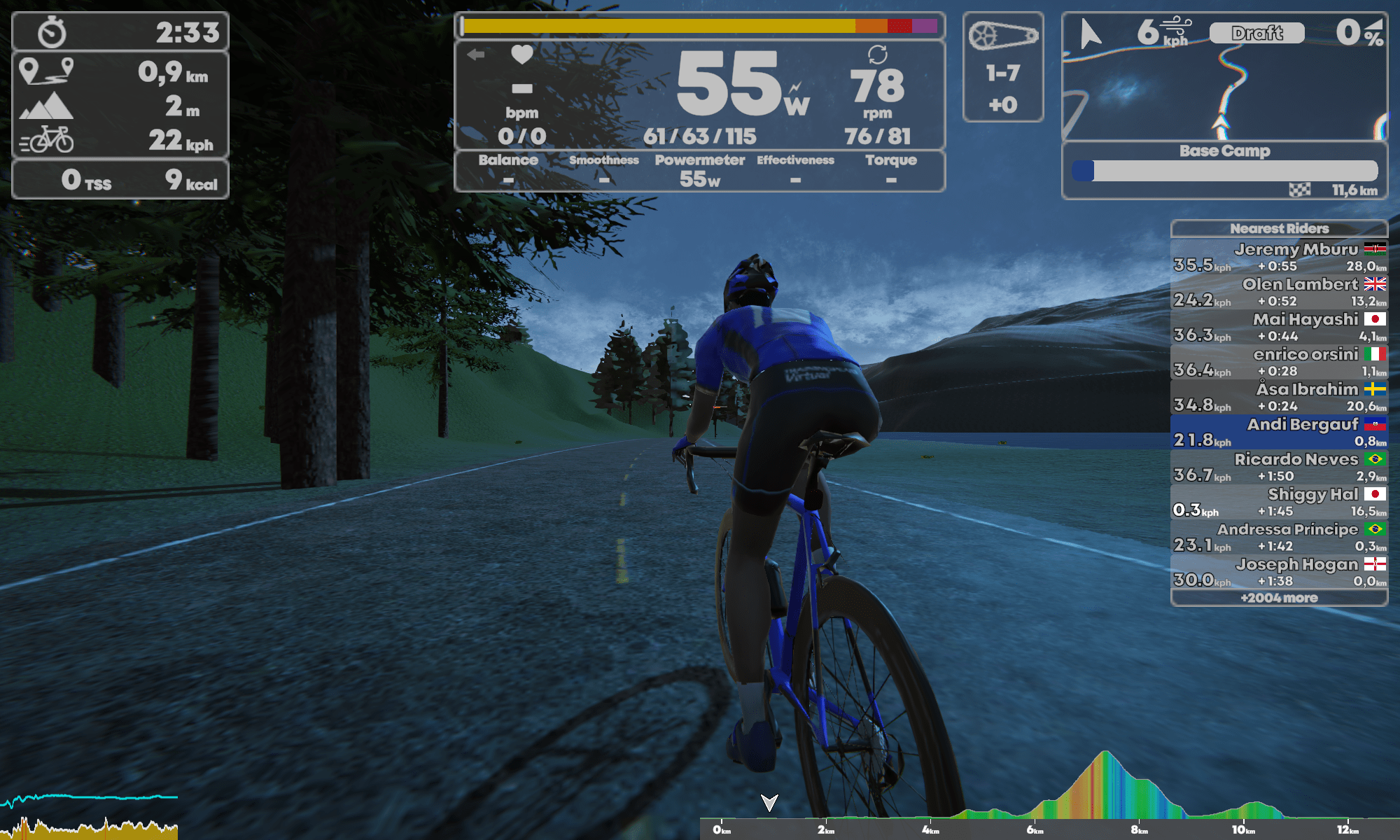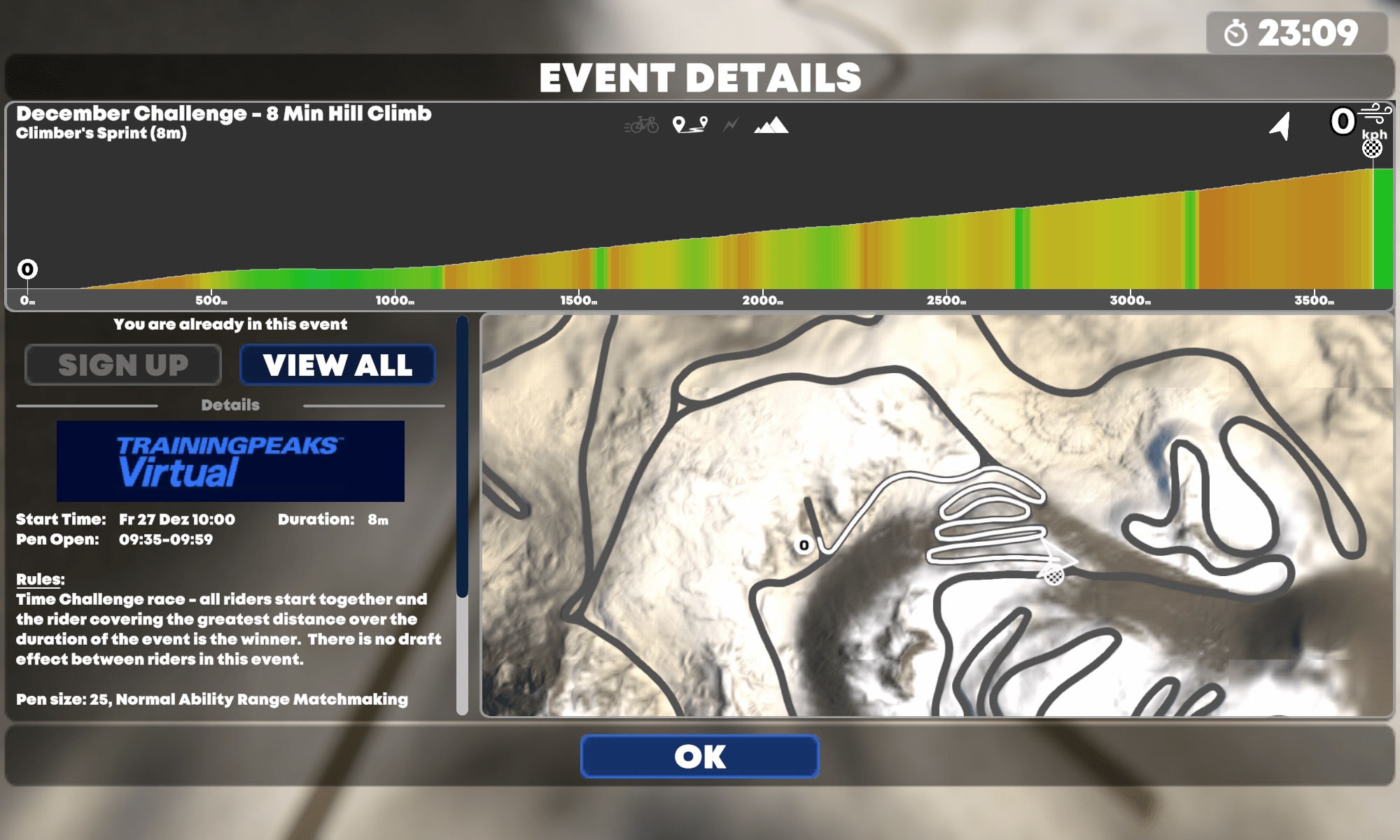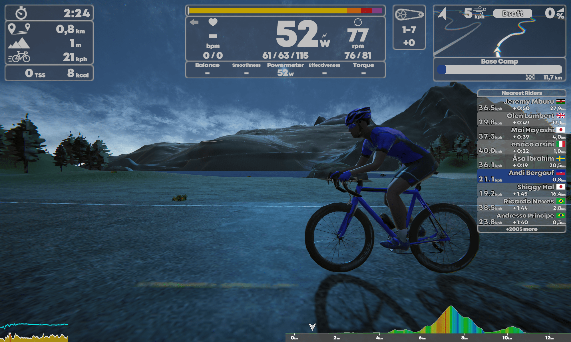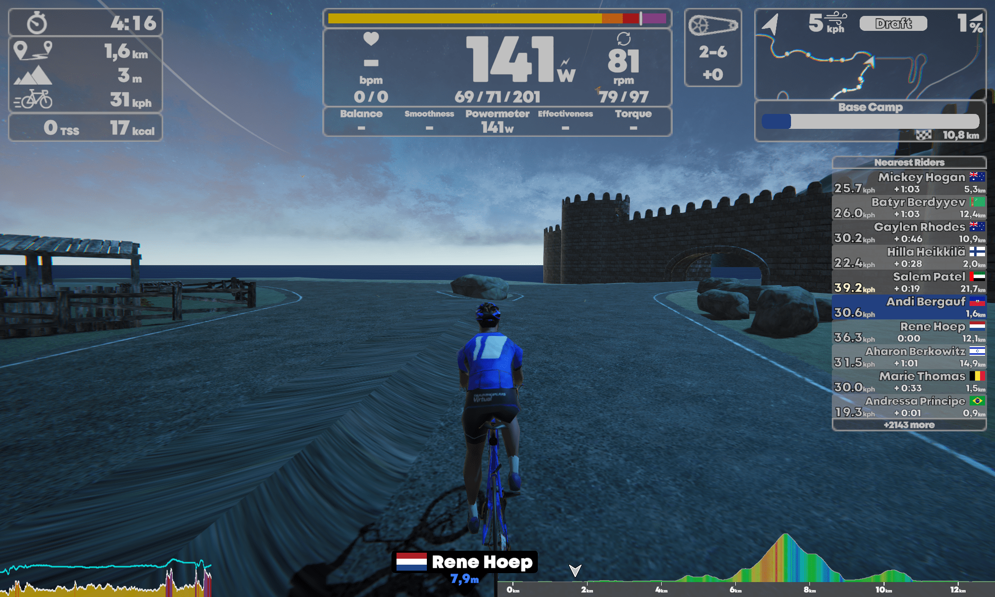 Im Hub, so nennt sich das Menü für die anstehende Trainingsfahrt, habe ich dazu noch die Möglichkeit Events auszuwählen, mir anzusehen was Kontrahenten schon abgerissen haben und denen auch zugucken, aber, und das ist wieder toll, auch direkt meine Profileinstellungen etc. zu verändern ohne groß hin und her zu klicken.
