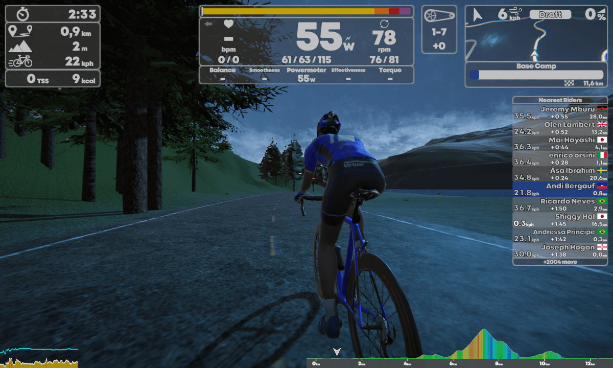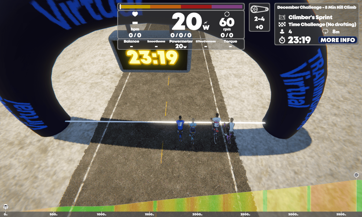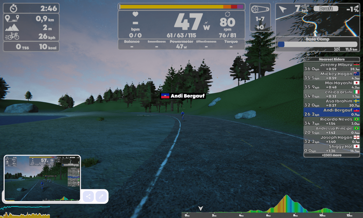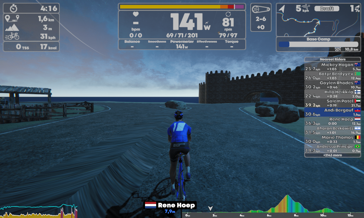 Richie und Tobi haben auf Youtube TrainingPeaks Virtual als „ernsthafte Alternative“ zu Zwift genannt. Davon ist TrainingPeaks Virtual in Wahrheit etwa genauso weit weg, wie ich von Pogačars FTP. Die Grafik ist lieblos, die Performance schlecht, die Auswahl der Strecken zu unecht. So fehlte hier komplett die Motivation indoor zu trainieren. Man muss einfach anerkennen, dass Zwift es drauf hat, Motivation für einen Groupride und Rennen zu schaffen.