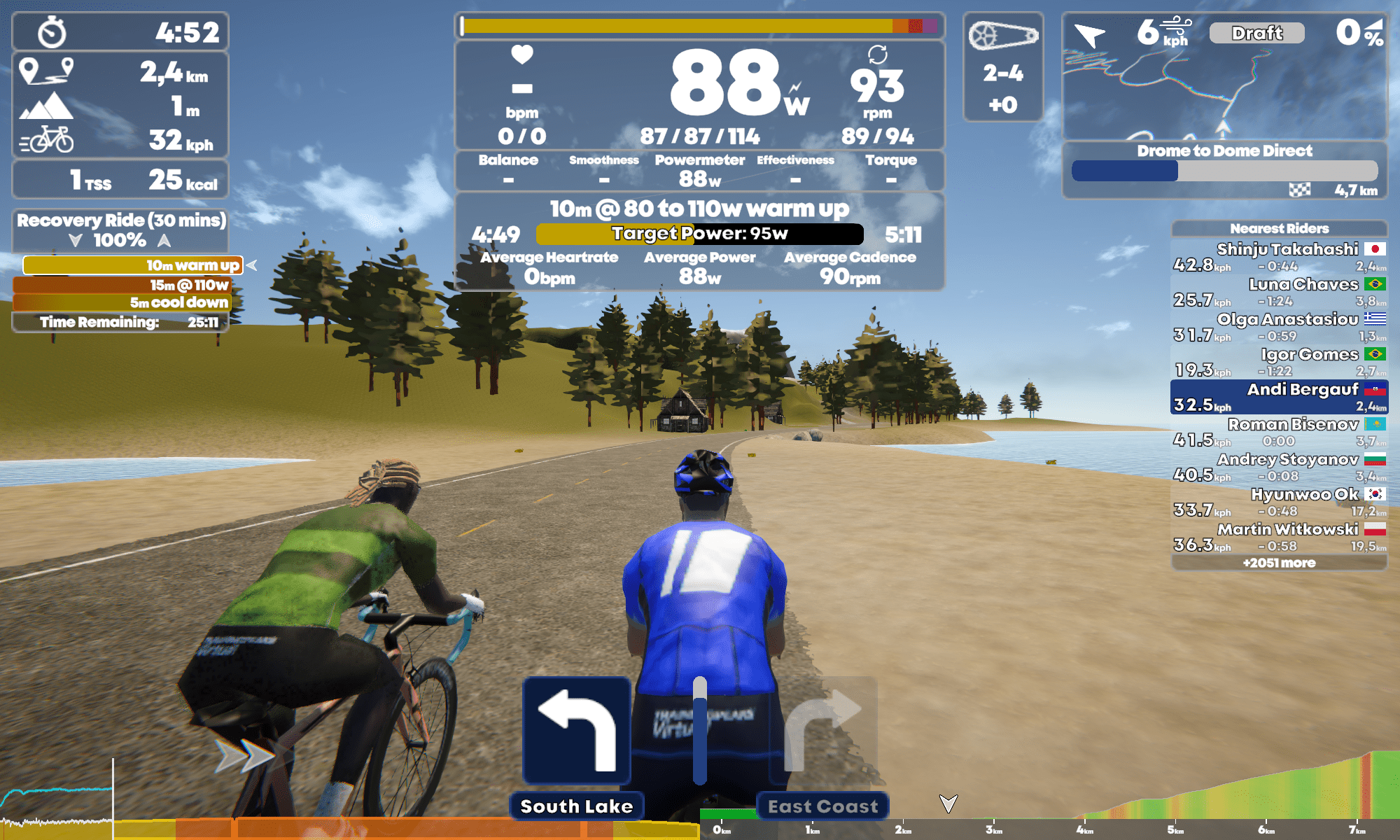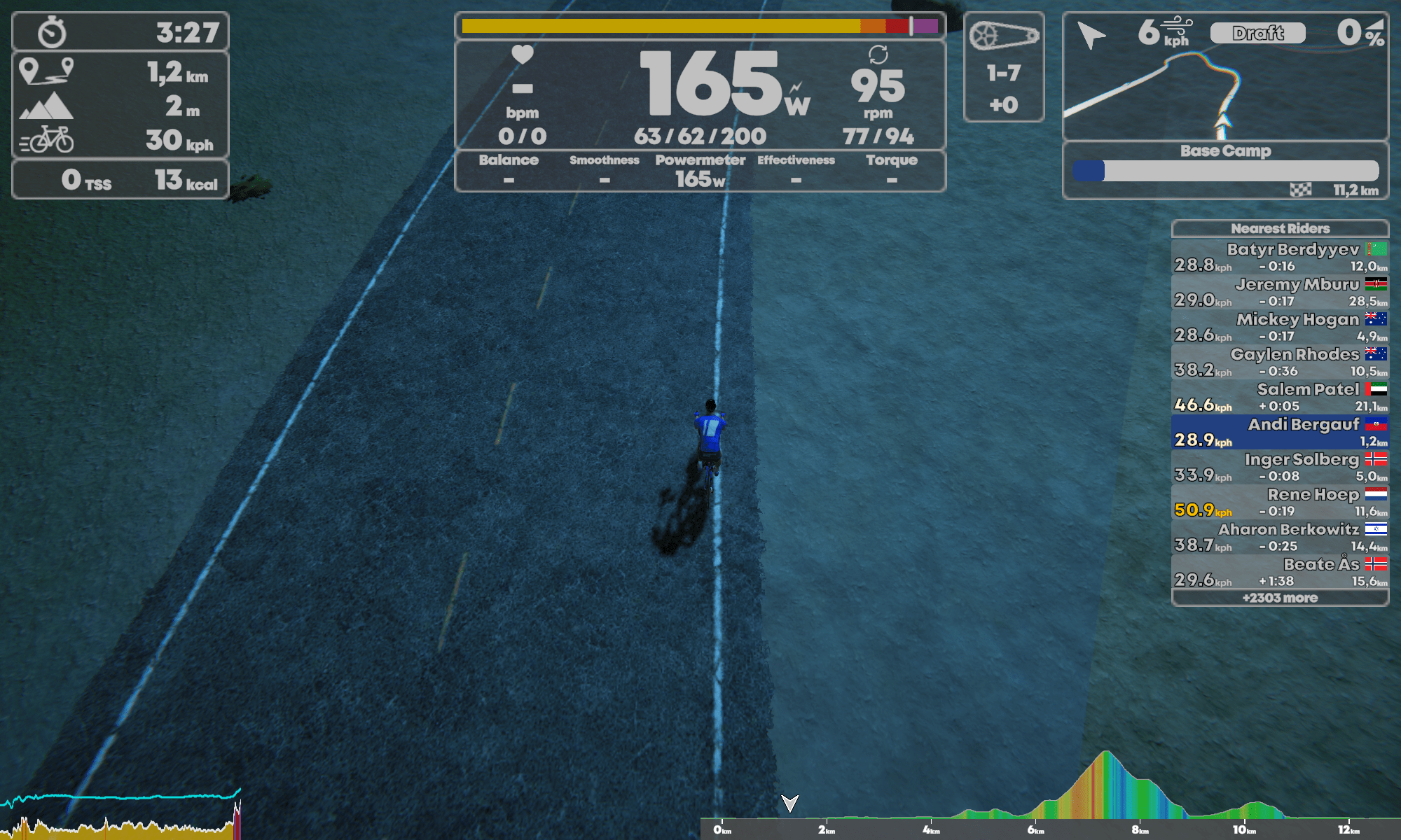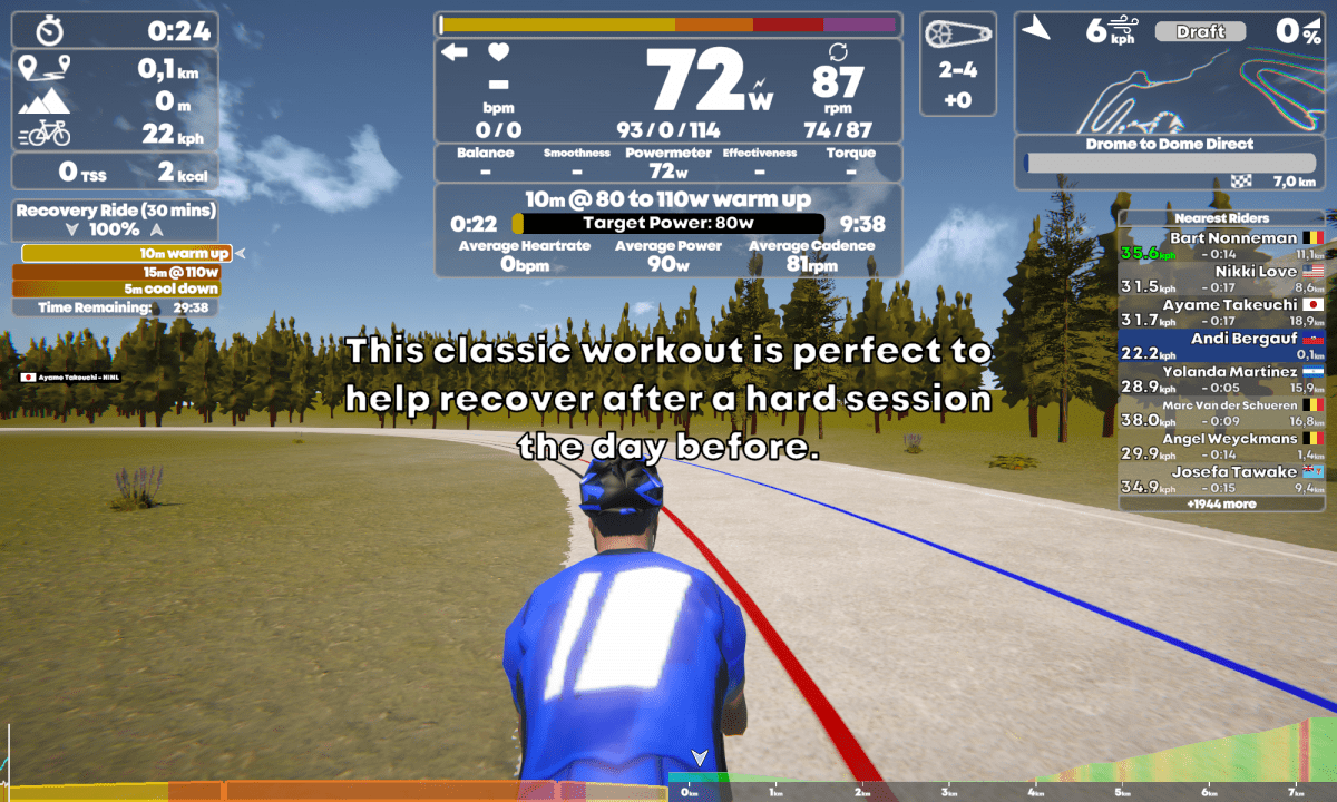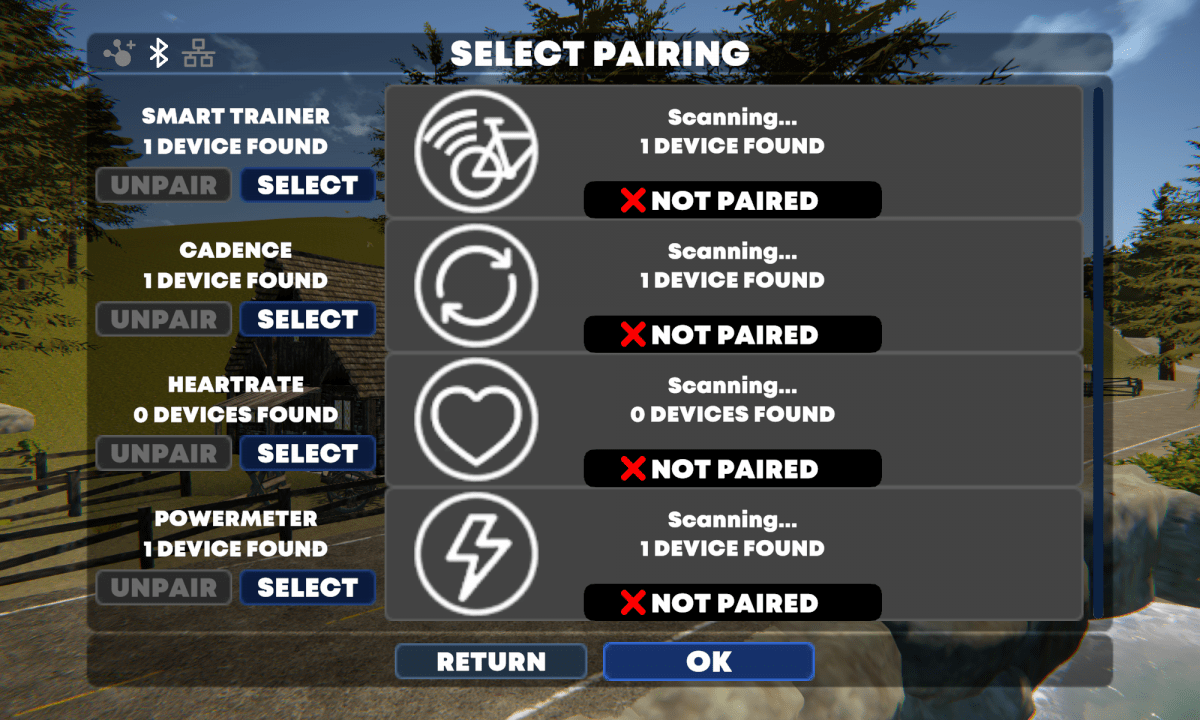 Das Kickr Bike ließ sich auf Anhieb verbinden, Powermeter, Kadenz, Pulsgurt natürlich auch. Gut gefällt mir, dass bei Geräten mit Batterie der Ladezustand mit angezeigt wird. Sowas wie Zwift Play zum Steuern gibt es hier nicht. An der Stelle gleich der Hinweis darauf, dass durch anderer Radfahrer auf der Strecke einfach hindurchgefahren wird.