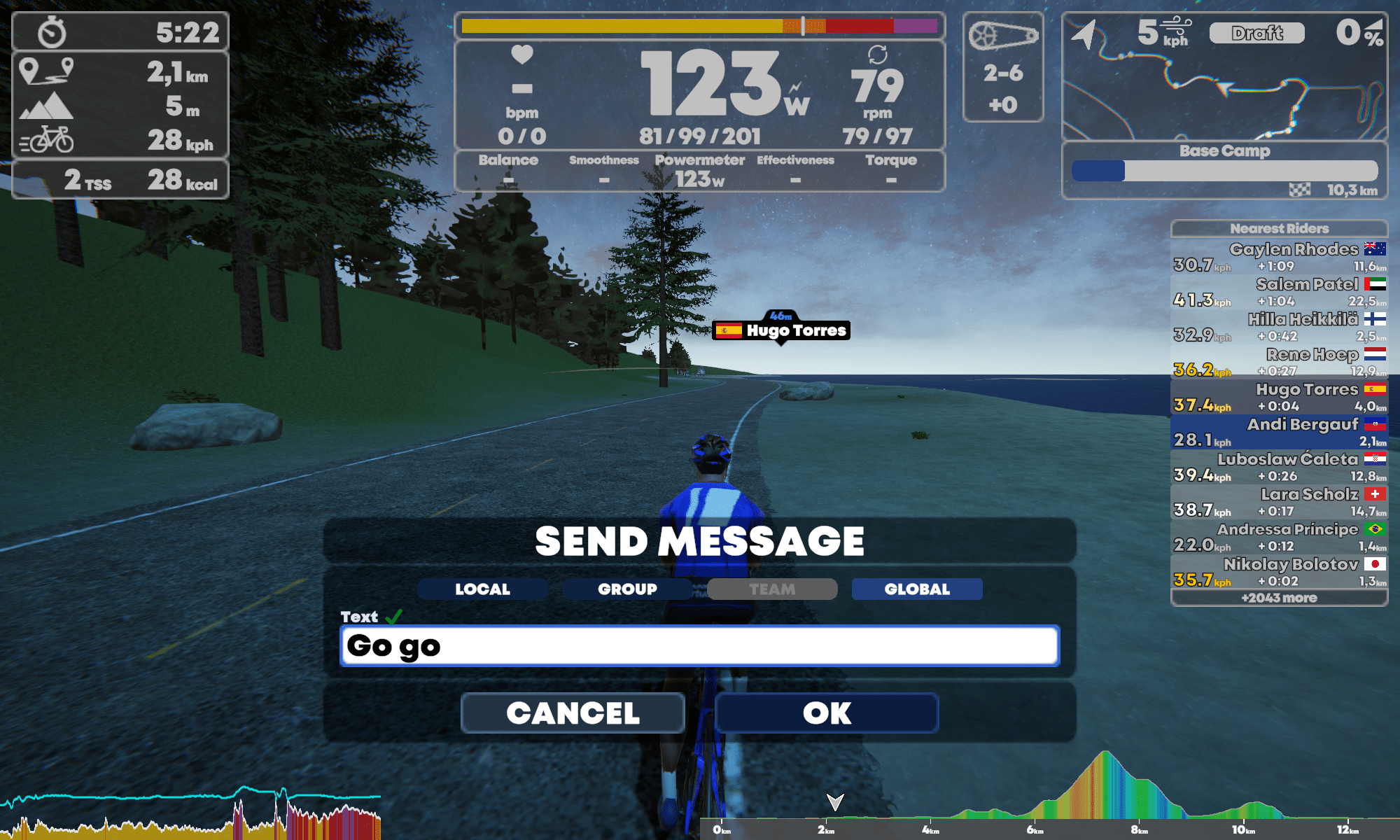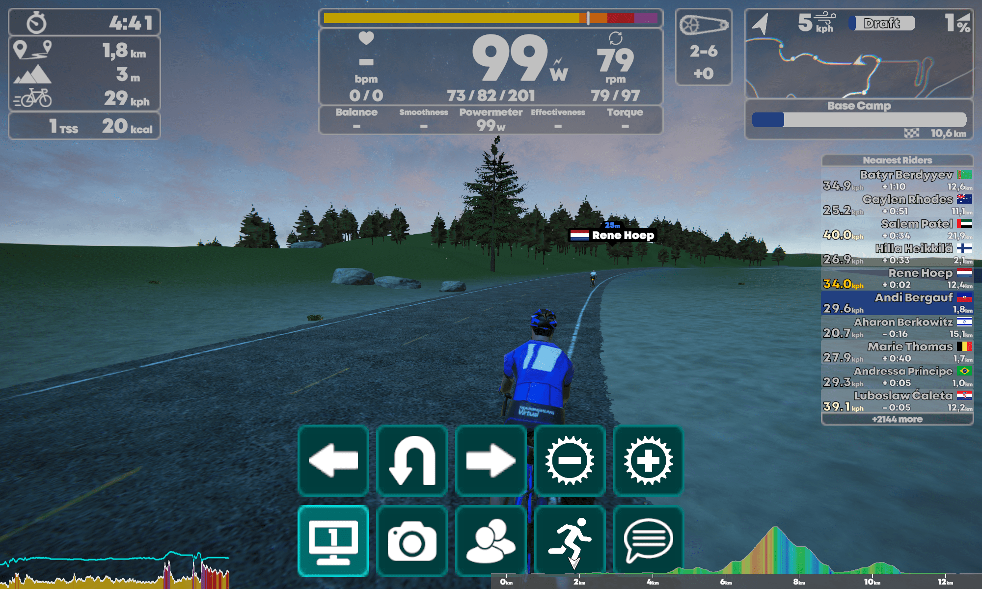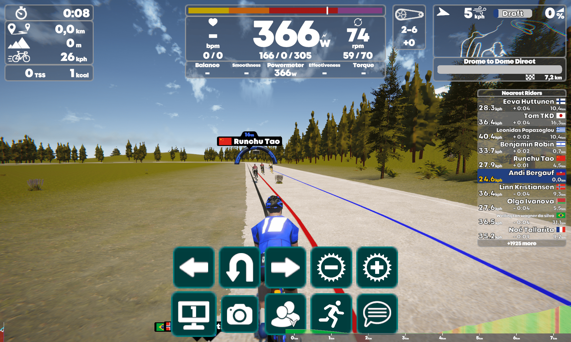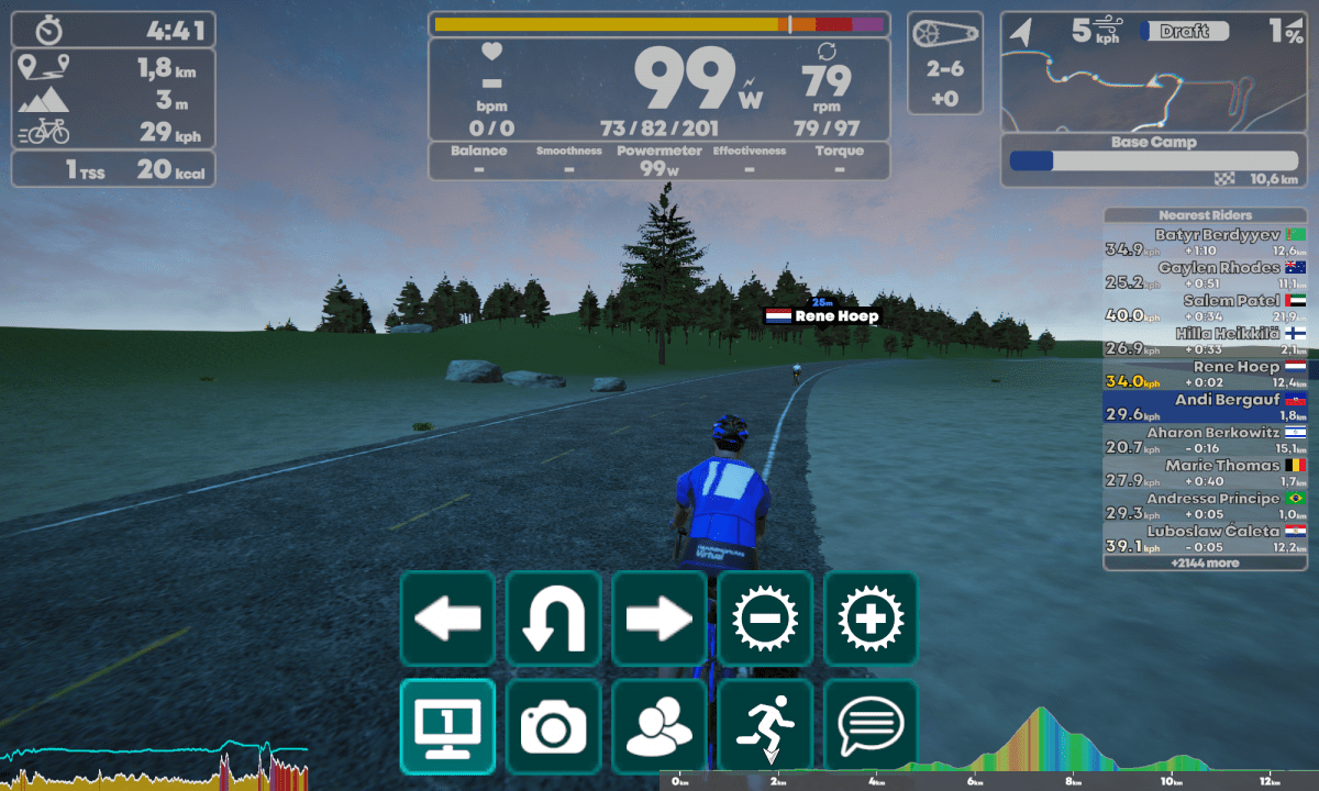 Durch andere Fahrer kann hindurchgefahren werden. Deshalb ist eine Steuerung des Avatars auch relativ unwichtig. Die UI wird wie von Zwift gewohnt durch Antippen des unteren Bildschirmrand hochgefahren. Links oder Rechts abbiegen, die Perspektive ändern, einen Pause machen oder eine Nachricht schreiben geht hier. Die beiden Zahnräder mit dem Plus- und Minuszeichen verändern den Widerstand.