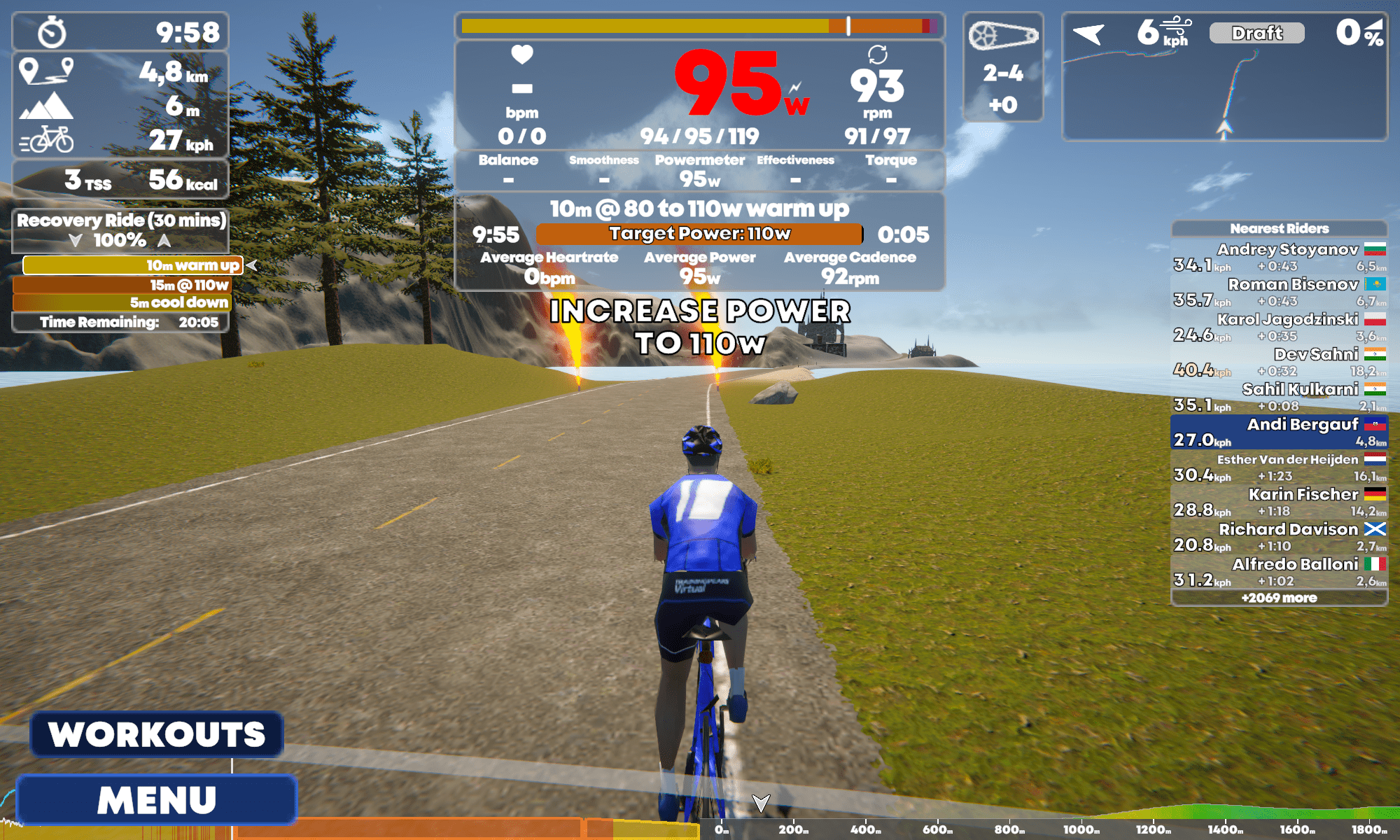 Bei meinem virtuellen Radsportler habe ich den voreingestellten Wattwert 200 bestätigt. Jetzt darf ich zwischen freier Fahrt, einem Event, Rennen und Workout wählen. Ich wähle einen Workout und die Strecke. Das Höhenprofil wird in einem Style dargestellt, der Sportler anspricht. Zwift steckt dagegen einfach zu sehr in der Spielekonsole-Mentalität fest. Und das macht sich auch bei der Darstellung des Hud bemerkbar.